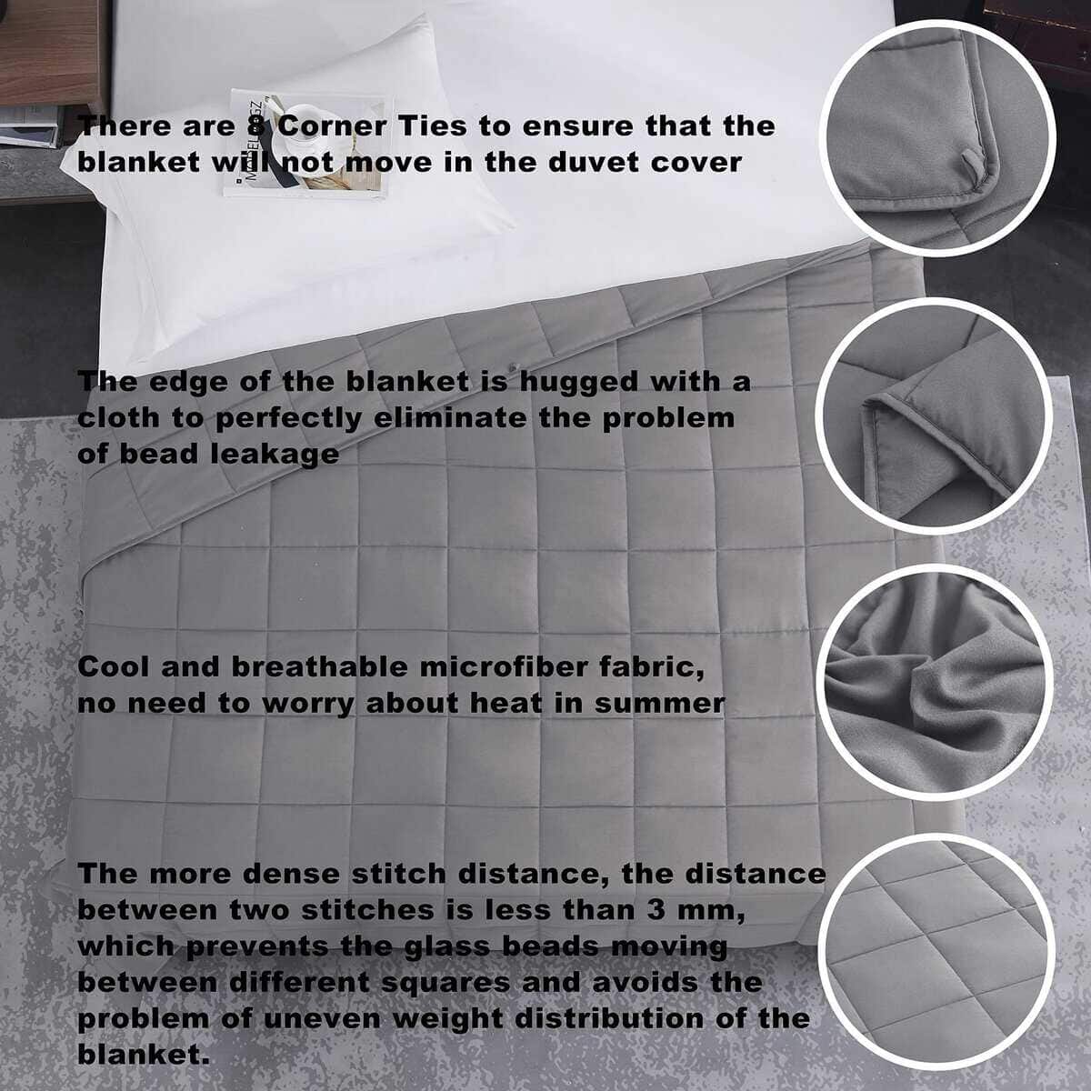 1. Material Premium: La manta ponderada está hecha de material suave y transpirable de microfibra y rellena con perlas de vidrio hipoalergénicas no tóxicas de 0,8-1 mm. Esta manta puede proporcionar una sensación de refrigeración en verano y un calor transpirable en invierno.