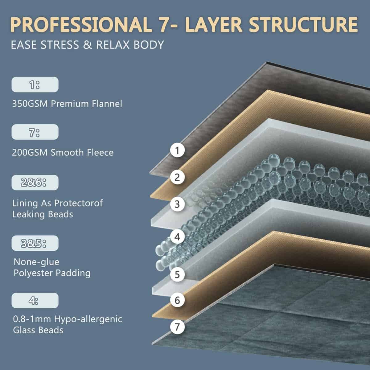 ¿Qué puedes hacer para ayudar a adaptarte a una manta ponderada? 1. Una manta calmante ponderada es más pesada que una manta normal. Si eliges un tamaño y peso adecuados basados en tu peso, por favor, dale de 7 a 10 días para adaptarte a este peso. 2. Podrías poner partes del cuerpo debajo de la manta durante el primer día si eres principiante. Mayormente cubriendo tu cintura y cadera, evitando hombros, pantorrillas. 3. Cuando te adaptes gradualmente a la manta, podrías cubrir todo el cuerpo. 4. Después de adaptarte totalmente a la manta ponderada, podría usarse junto con otro edredón para mantenerse caliente en el invierno frío. Recordatorio: 1. Se recomienda lavado a mano. La manta ponderada es lavable, pero el lavado frecuente a máquina podría dañar la manta pesada. 2. La manta abrazo ponderada utiliza tela transpirable, que es adecuada para todas las estaciones. Pero debido a su peso, también puede sentir calor, por lo que se recomienda un ventilador o un aire acondicionado. 3. Una manta abrazo ponderada sería más pequeña que una manta ordinaria, lo que puede ayudar a concentrar el peso en tu cuerpo. 4. No se recomienda la manta ponderada para menores de 3 años y mujeres embarazadas, y no cubras tu rostro con la manta. 5. Si tienes articulaciones débiles o sensibles (rodilla, cadera, espalda o dolor en las articulaciones), por favor, evita usarla. 6. Mantente alejado de incendios, calentadores o cualquier otra fuente de calor. 7. Las personas con riesgos para la salud deben consultar a su médico antes de usar mantas ponderadas.