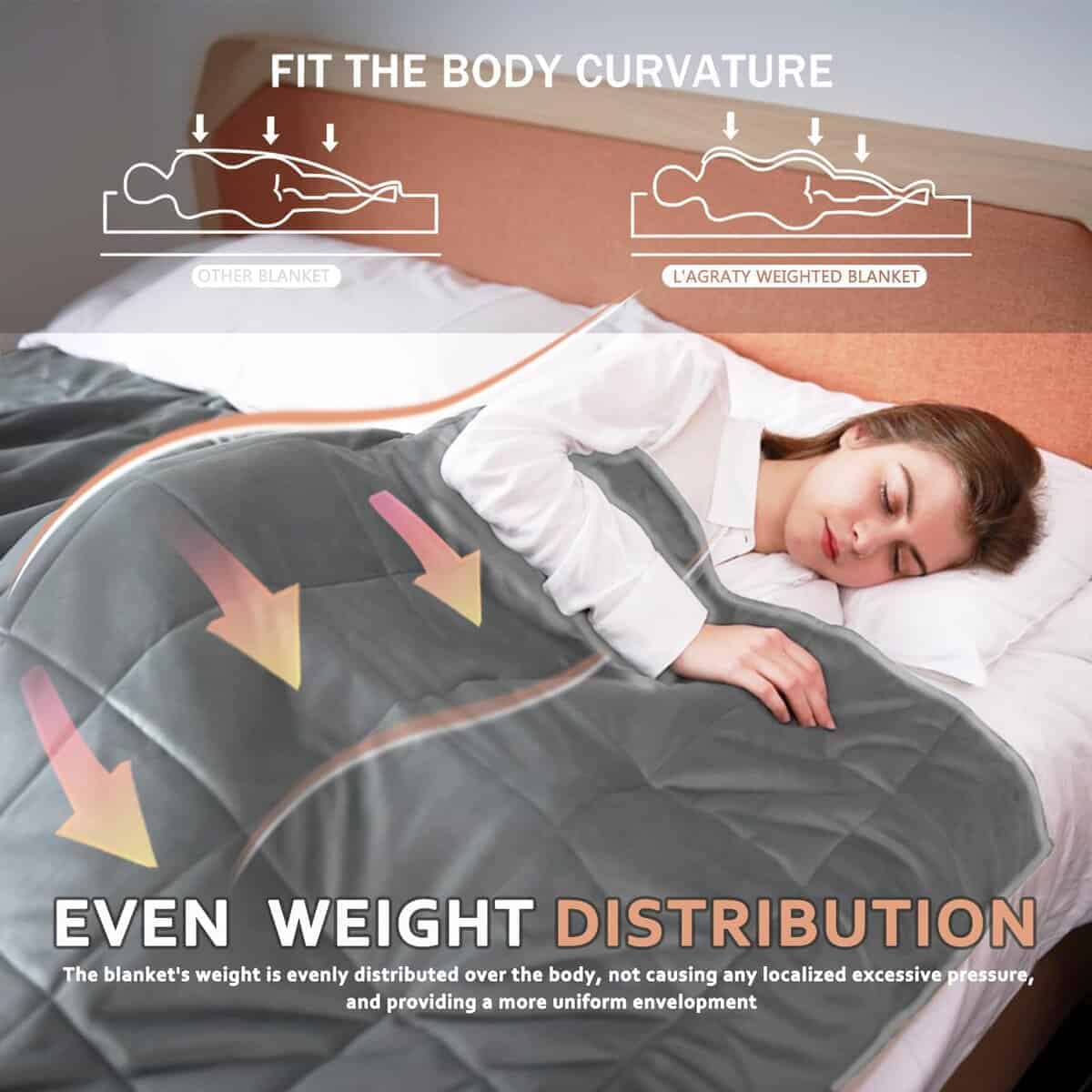 La manta ponderada L’AGRATY es ideal para mantenerte cómodo y abrigado durante todas las estaciones del año. Su material suave y transpirable combinado con cuentas de vidrio hipoalergénicas no tóxicas proporciona una sensación acogedora y cálida en el invierno. Recomendamos elegir el tamaño y peso adecuados según nuestras recomendaciones para garantizar su máxima comodidad y beneficios. Nuestra manta ponderada ha sido diseñada con tecnología de posicionamiento preciso para asegurar que las cuentas de vidrio estén distribuidas de manera uniforme, evitando la molestia de peso desigual. Tenga en cuenta que el tamaño de la manta ponderada es más pequeño que una manta tradicional, ya que está diseñada para concentrar el peso en el cuerpo y no colgar del borde de la cama. Disfrute de una experiencia de compra placentera con nosotros, ¡y recuerde que normalmente toma tiempo ajustarse al peso de una manta ponderada por primera vez!
