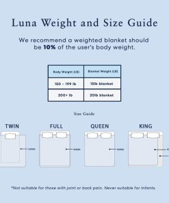 1. : Mantente fresco y cómodo durante todo el año con nuestra manta ponderada premium Luna Cooling, diseñada para mantenerte fresco en verano y acogedor en invierno. Perfectas mantas de enfriamiento derivadas de bambú para personas calurosas que luchan con el sueño o la ansiedad. 2. : Bamboo-Derived Lyocell con micro cuentas de vidrio, nuestra manta ponderada refrescante es el edredón ultra transpirable y que absorbe la humedad perfecto, garantizando que te mantengas seco y cómodo durante toda la noche al usar nuestras mantas de enfriamiento y edredones frescos para personas calurosas. 3. : Diseñada para usar durante todo el año, nuestra manta de enfriamiento derivada de bambú brinda el nivel perfecto de presión para ayudarte a dormir mejor. Nuestro material de manta de enfriamiento para todas las estaciones garantizará una experiencia de relajación refrescante. Disponible en tamaños de Niño, Individual, Matrimonial, Queen y King, y pesos que van desde 10 lbs a 25 lbs, hay una opción para Niños y Adultos. ¡Consulta nuestras tablas de tamaños y pesos para descubrir la manta ponderada ideal para cualquier temporada! 4. : ¡Las mantas ponderadas Luna son fáciles de mantener! Para mantas de 15 lbs o menos, simplemente lávalas a máquina en frío en un ciclo suave o lávalas a mano, cuélgalas para secarlas o ponlas en secadora a baja temperatura si es necesario. Para mantas más pesadas de más de 15 lbs, te recomendamos lavar a mano o limpiar solo en manchas para garantizar una larga vida útil. Evita lavar a máquina y secar en secadora para evitar daños, ya que la mayoría de las máquinas solo pueden soportar de 10 lbs a 15 lbs. Siempre consulta el manual del fabricante de tu máquina para conocer la capacidad de peso. 5. : Luna ha sido líder en tecnología de sueño confortable desde 2015, ayudando a más de 5 millones de personas a obtener su mejor sueño. ¡Los productos de mantas pesadas Luna para la ansiedad están investigados, desarrollados y diseñados en los EE. UU., Luna es un producto altamente valorado en el mundo de los lujosos durmientes ponderados enfriados. Nos enorgullece ofrecer una manta ponderada para adultos premium al mundo.