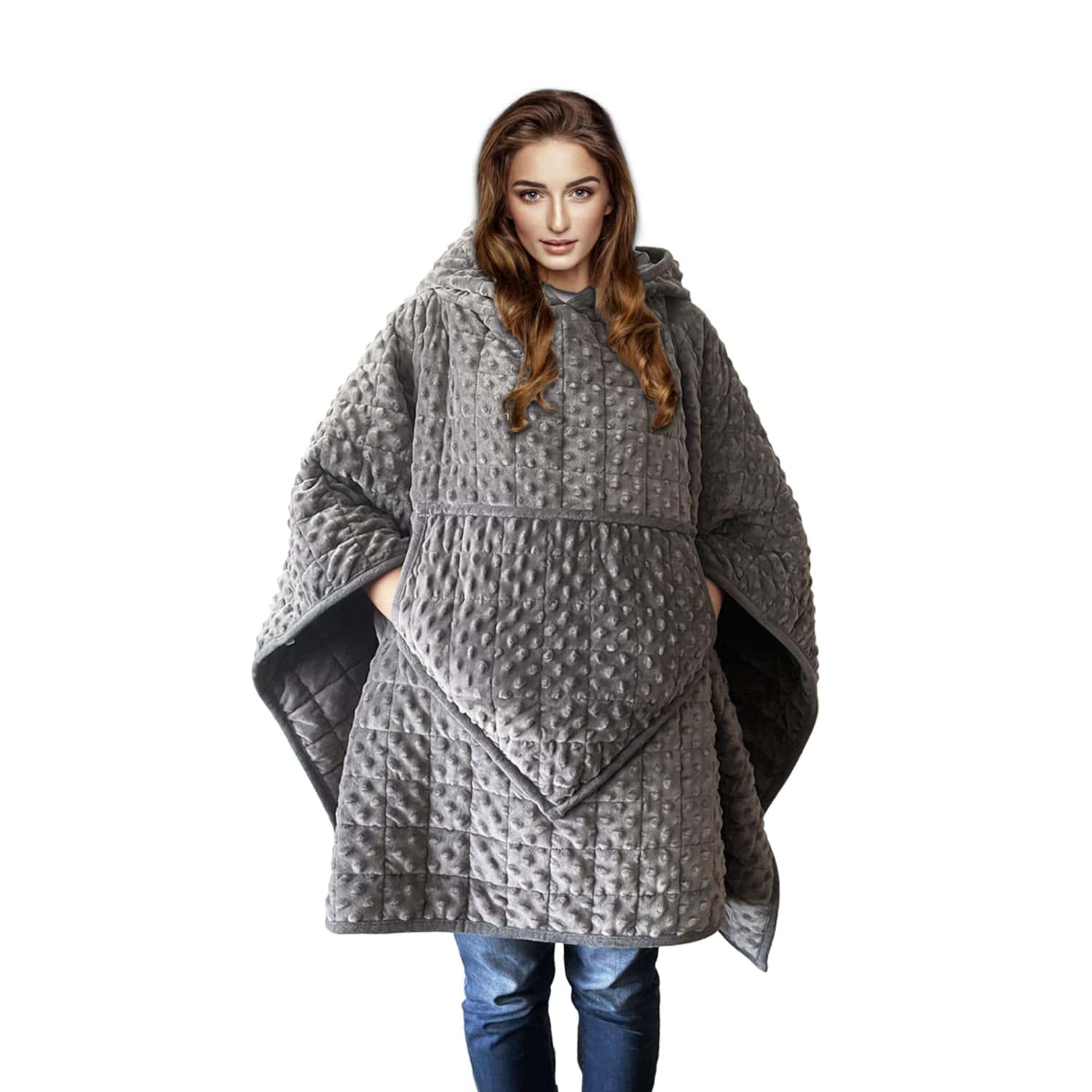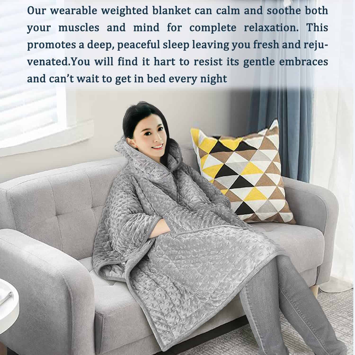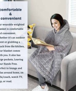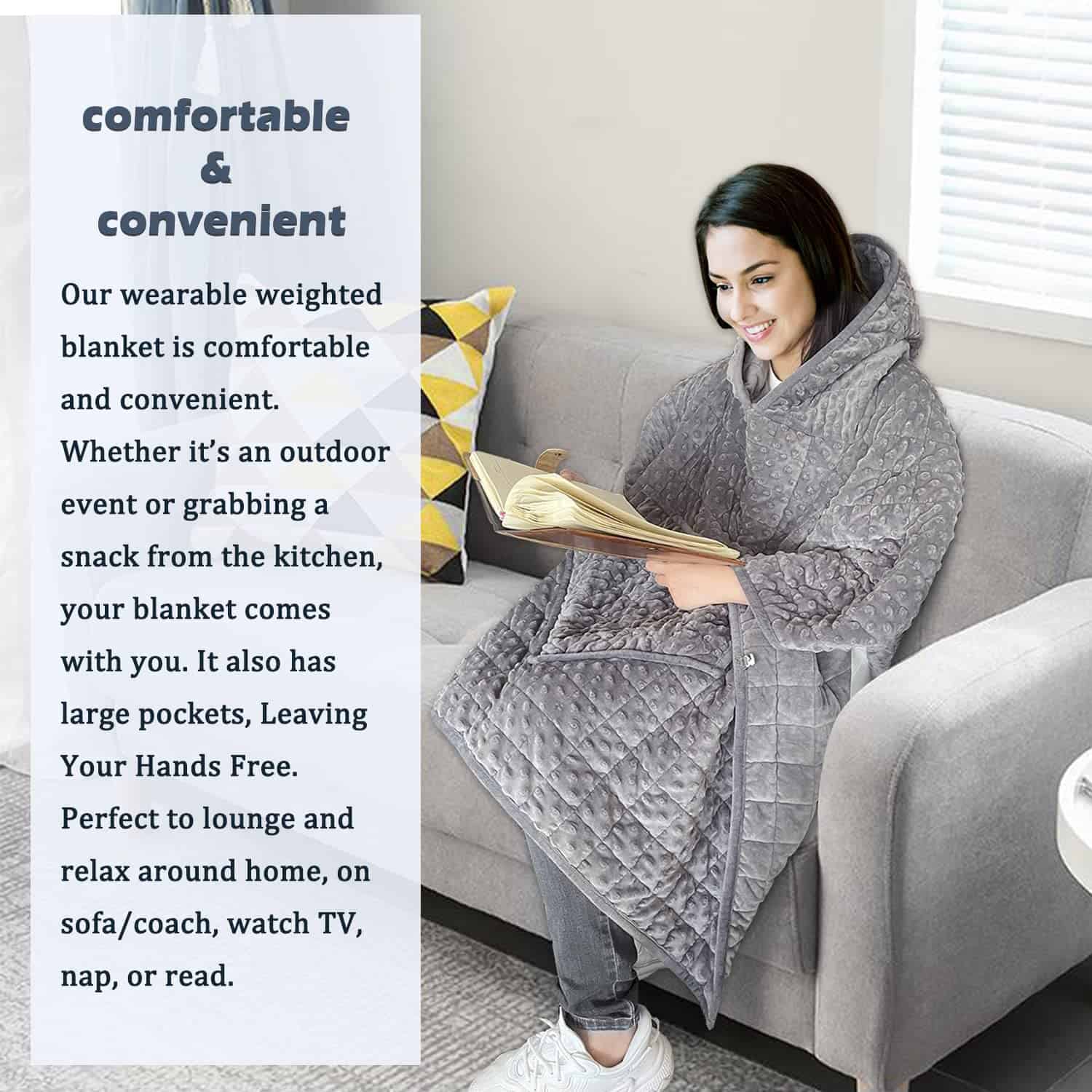 3. SUAVE Y CONVENIENTE: Nuestra manta ponderada es cómoda y conveniente. Ya sea en un evento al aire libre o tomando un refrigerio en la cocina, tu manta te acompaña. También tiene bolsillos grandes, dejando tus manos libres. Perfecto para relajarse en casa, en el sofá, ver la televisión, echar una siesta o leer.