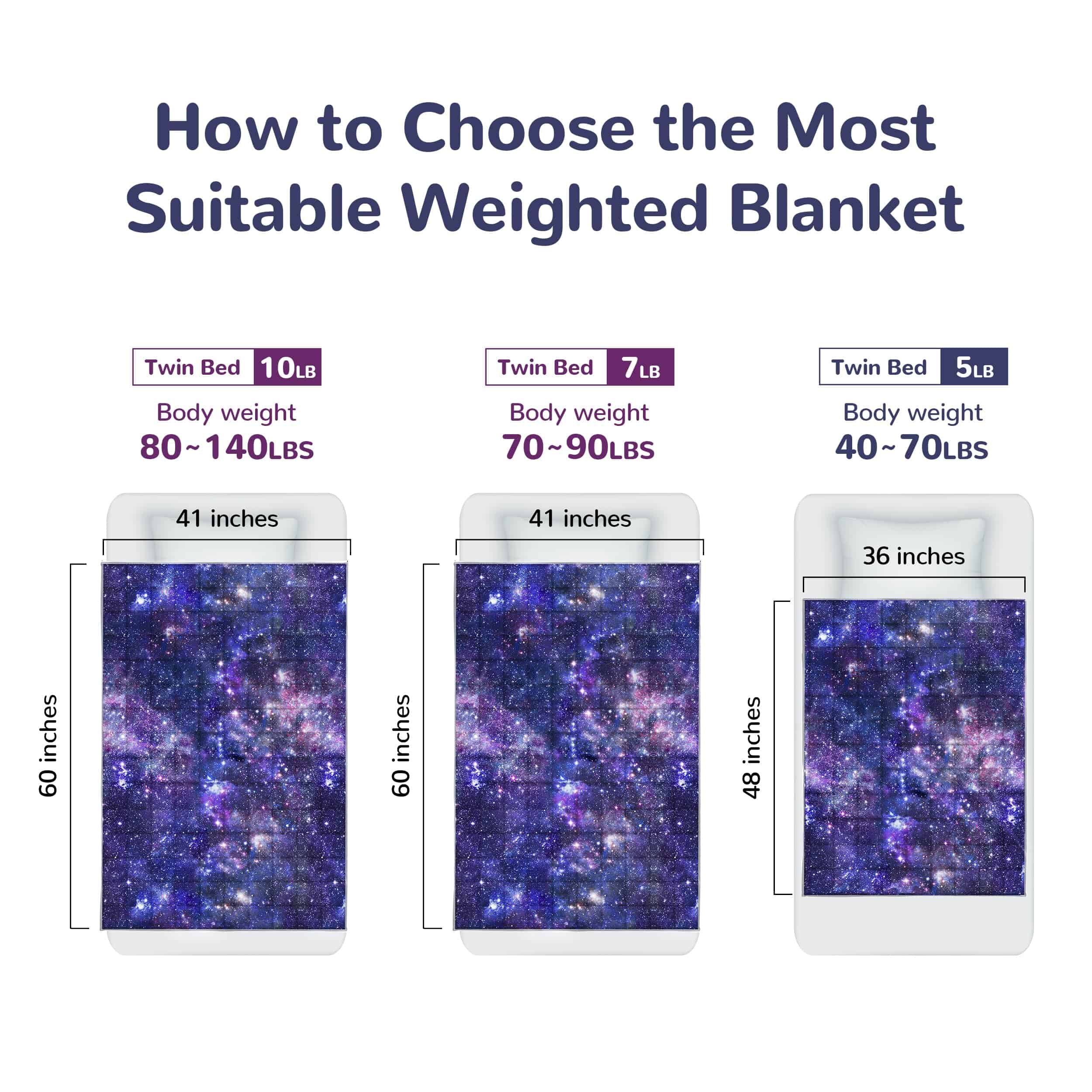 2. Dos Tamaños para Elegir: 5 lbs y 7 lbs. Elija una manta ponderada que pese aproximadamente entre el 6% y el 10% del peso corporal. Si nunca ha usado una antes, suele ser una buena idea comenzar con una manta más ligera.