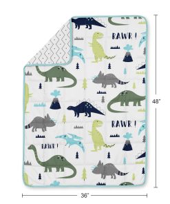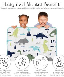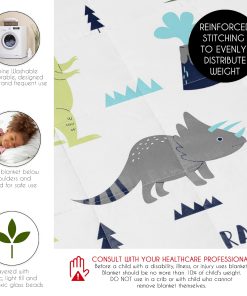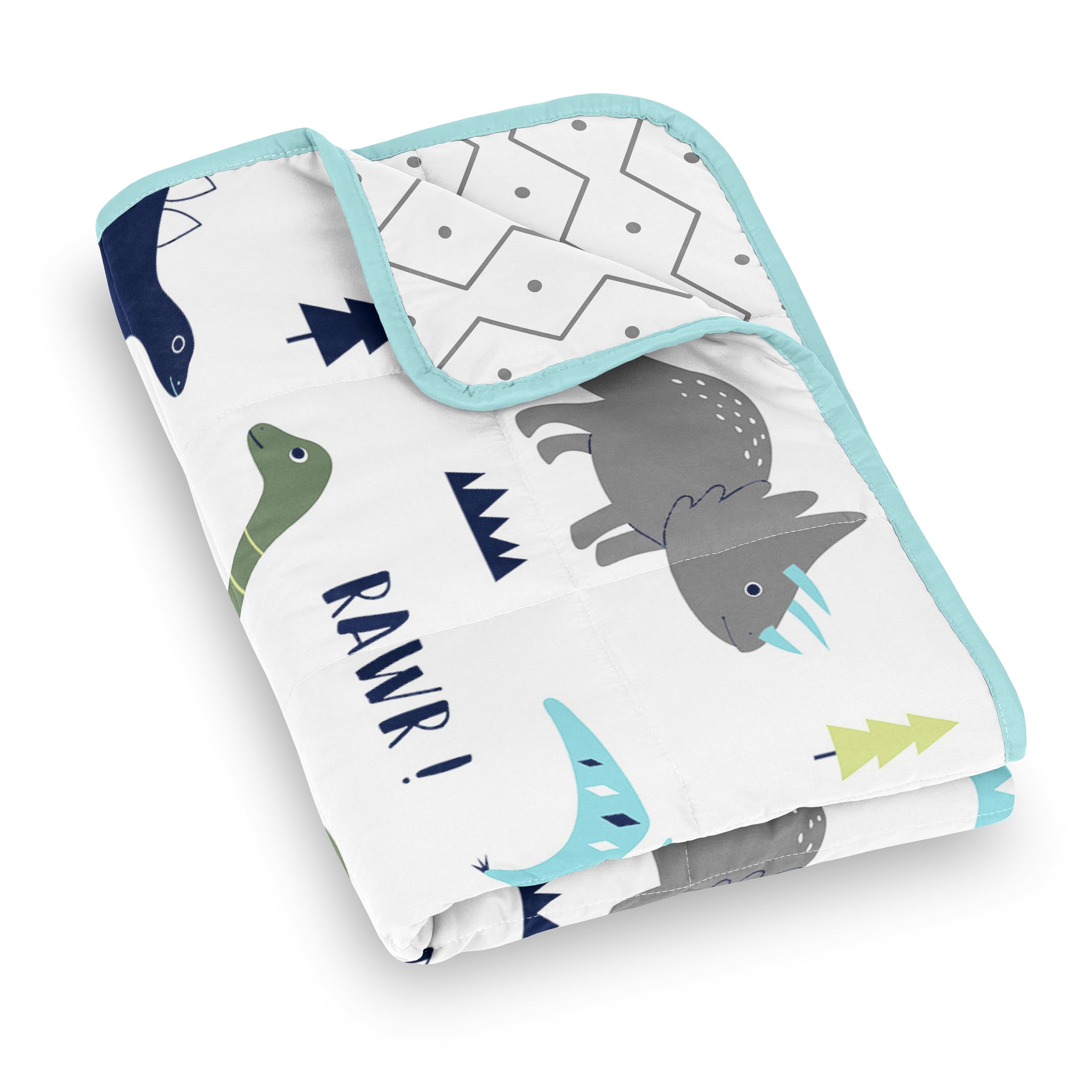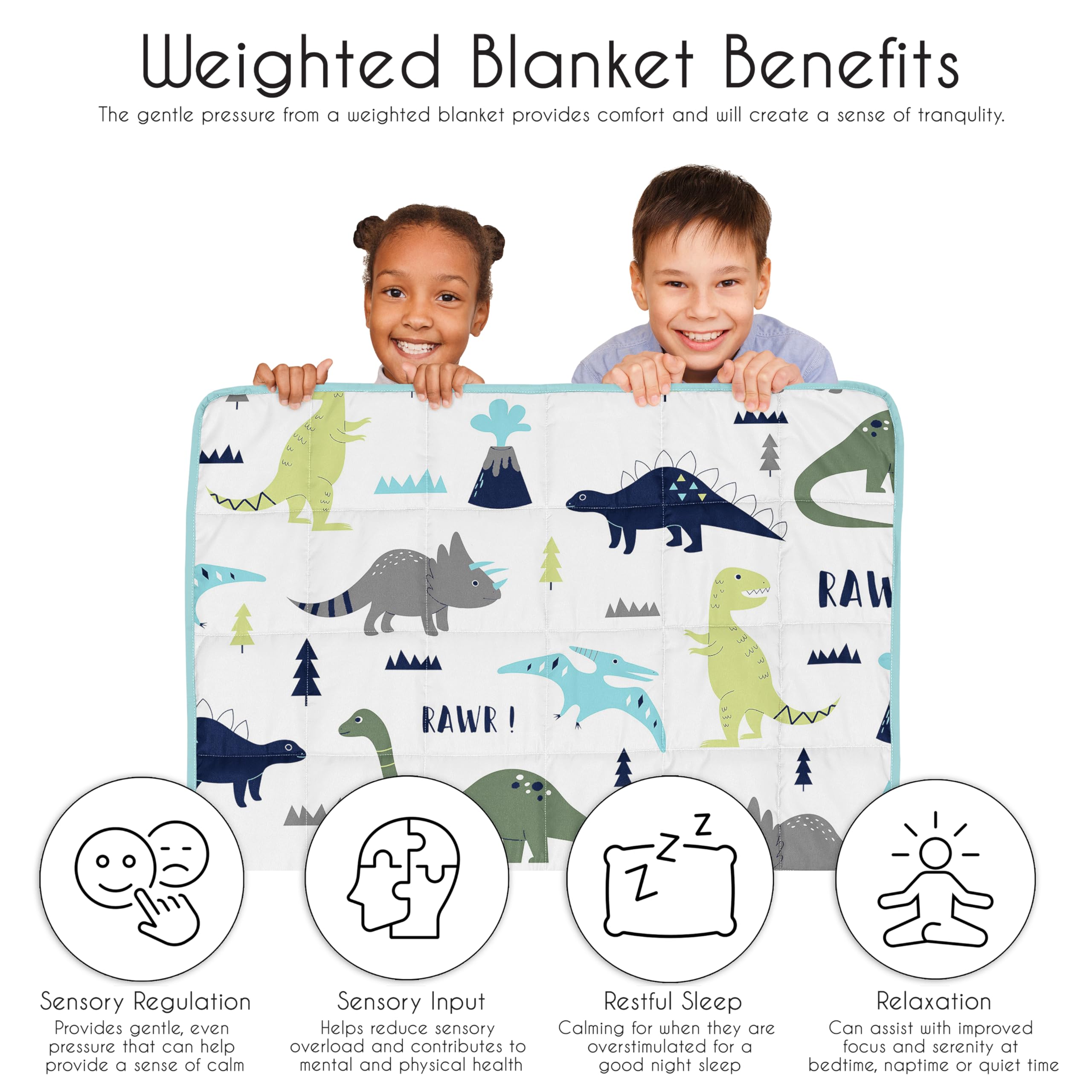Diseñada con un relleno ligero y cuentas de vidrio no tóxicas distribuidas uniformemente, esta manta ponderada cuenta con una capa exterior de tela de microfibra cepillada de diseño exclusivo con estampado de modernos dinosaurios y prehistóricos en azul marino y verde oscuro, y blanco y gris bohemio de un volcán de moda, que se invierte en un estampado de chevron geométrico en blanco y gris, y está rematada con un borde de color turquesa sólido. Esta manta ponderada para niños se convertirá en un comfort esencial durante las noches inquietas. Los beneficios de una manta ponderada para niños van más allá de un sueño tranquilo. Proporcione un santuario en los días abrumadores para su hijo simulando el abrazo de sus seres queridos mientras duerme, ve la televisión, lee, viaja en carretera, durante el tiempo de juego, coloreando, o frente a la pantalla. Para un ajuste óptimo, asegúrese de que el peso de la manta no exceda el 10% del peso del niño para que no sea ni demasiado ligera ni demasiado pesada, y sea cómoda para cualquier temporada. Esta almohadilla de regazo ponderada es la adición perfecta para la renovación del dormitorio de su niño pequeño. Ordene todas las que necesite para la siesta, la hora de la tarea, los abrazos nocturnos, las pijamadas, los viajes, acampar, los paseos en auto y mucho más. Mantenga un extra en la oficina para obtener un momento de zen en el medio del día. También es un gran regalo para coordinar con los juegos de ropa de cama, juegos de sábanas, tratamientos de ventanas y soluciones de almacenamiento de Sweet Jojo Designs.