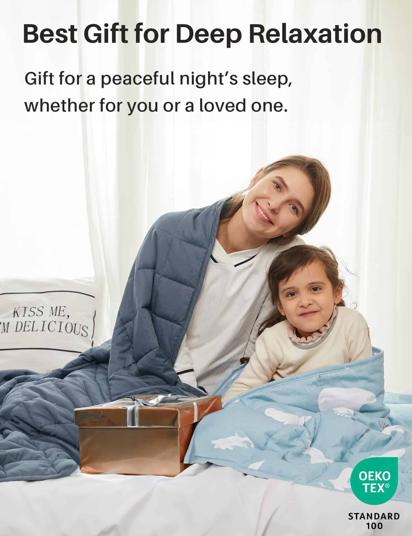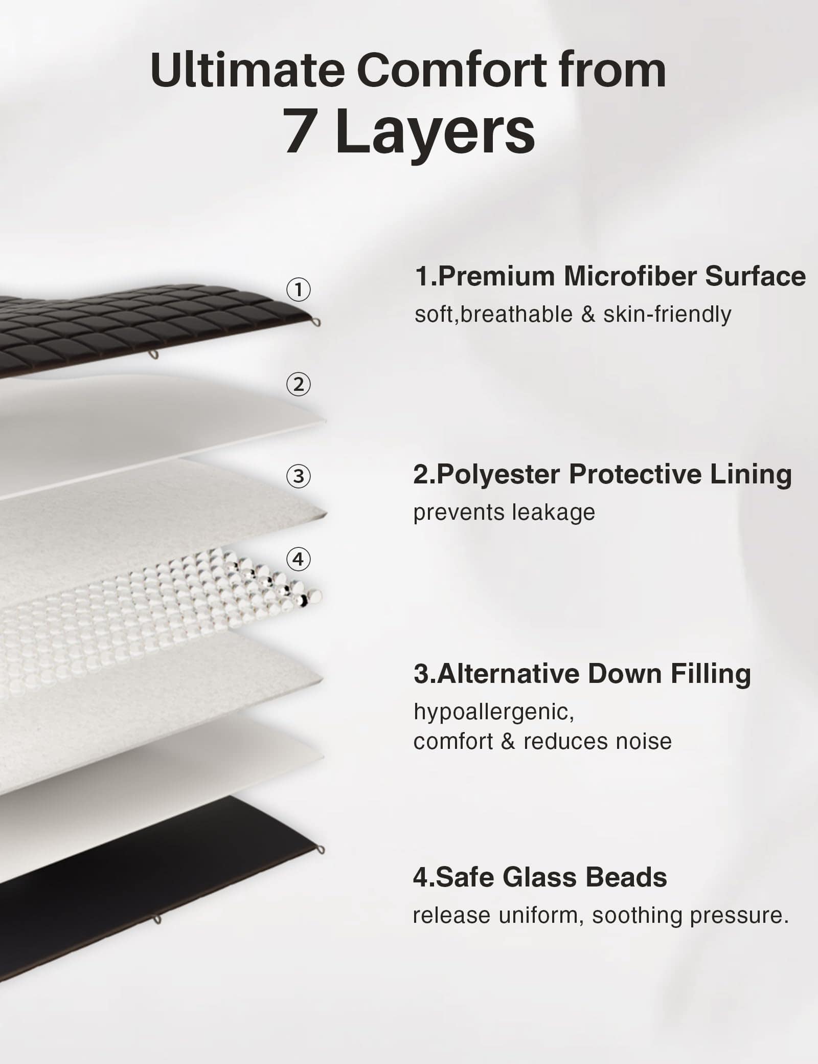 Para garantizar tu comodidad, la manta ponderada está hecha de materiales certificados por OEKO-Tex, que brindan una sensación cómoda, transpirable y refrescante. La versión mejorada cuenta con perlas de vidrio RECICLABLES que ofrecen el peso adecuado para mantenerte fresco en verano y cálido en invierno.