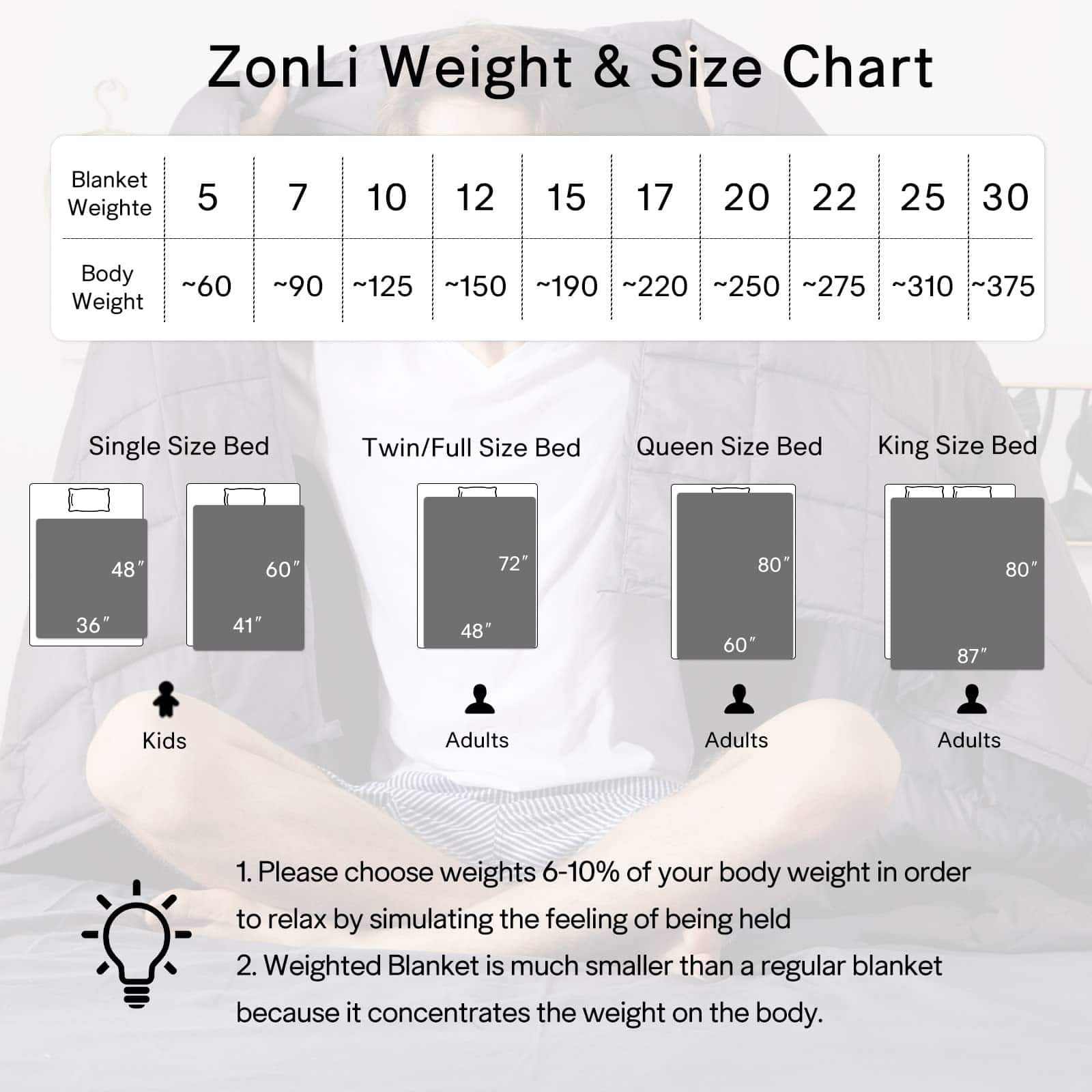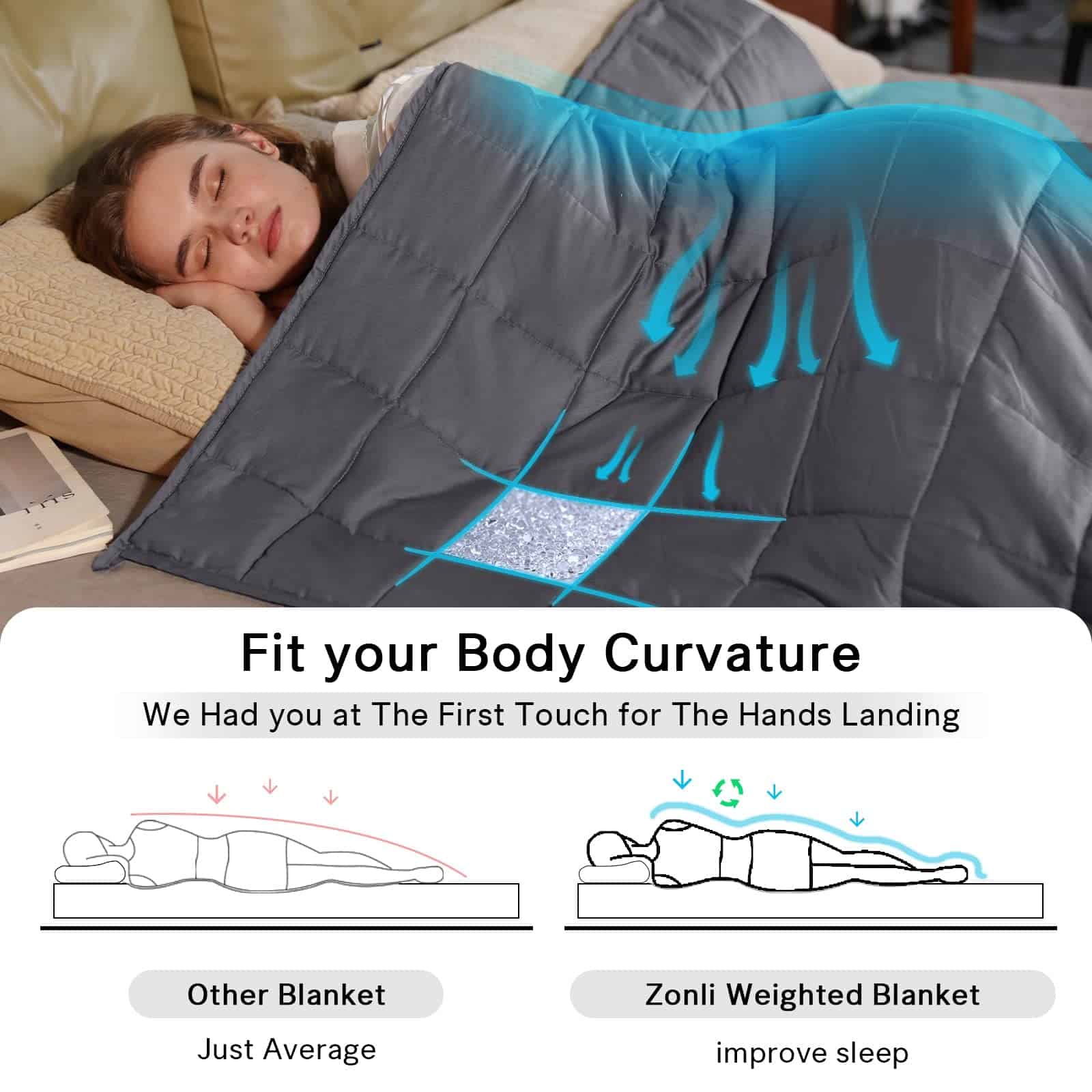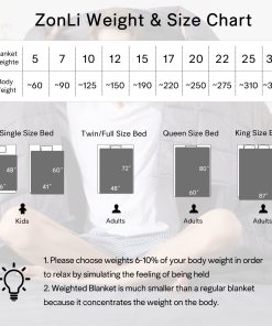 Manta ponderada ZonLi (60»x80», 22lbs, Tamaño Queen, Gris Oscuro), Manta ponderada para adultos, Manta pesada de alta transpirabilidad, Material suave con cuentas de vidrio premium. ZonLi manta ponderada ofrece una forma natural de relajar su cuerpo para una noche de sueño reparador. Perfecto para aquellos que necesitan relajarse y tener una buena noche de sueño. La manta pesada ZonLi utiliza tecnología de costura de alta densidad, se agregan dos capas de microfibra para prevenir la pérdida de hilos y la fuga de cuentas. El diseño único de 7 capas mantendrá firmemente las cuentas en su interior para la mejor transpirabilidad y mantenerlo a la temperatura perfecta, perfectamente adaptado para su uso durante todo el año. La manta ponderada refrigerante ZonLi cuenta con compartimentos pequeños de 5×5 con costuras de precisión (2.5-2.9 mm por costura) para evitar que las cuentas se transfieran de un compartimento a otro, haciendo que la manta distribuya el peso de manera uniforme y permita que la manta se adapte a su cuerpo. Elige la manta ponderada ZonLi que pese entre el 6% al 10% de tu peso corporal y una más ligera para probarla por primera vez. La manta ponderada de 60×80 de 22 libras es adecuada para una persona de aproximadamente 275 libras o para 2 personas compartiendo (Twin/Full/Queen). Nota: el tamaño de la manta es el tamaño de la manta, no de la cama. Cualquier manta pesada puede dañar su lavadora, pero la funda es lavable a máquina y muy fácil de limpiar y secar. Recomendamos lavar a mano y secar al aire como la mejor forma de limpieza. Si es posible, se recomienda altamente una funda de edredón ZonLi. ¡Contáctenos si tiene alguna pregunta!
