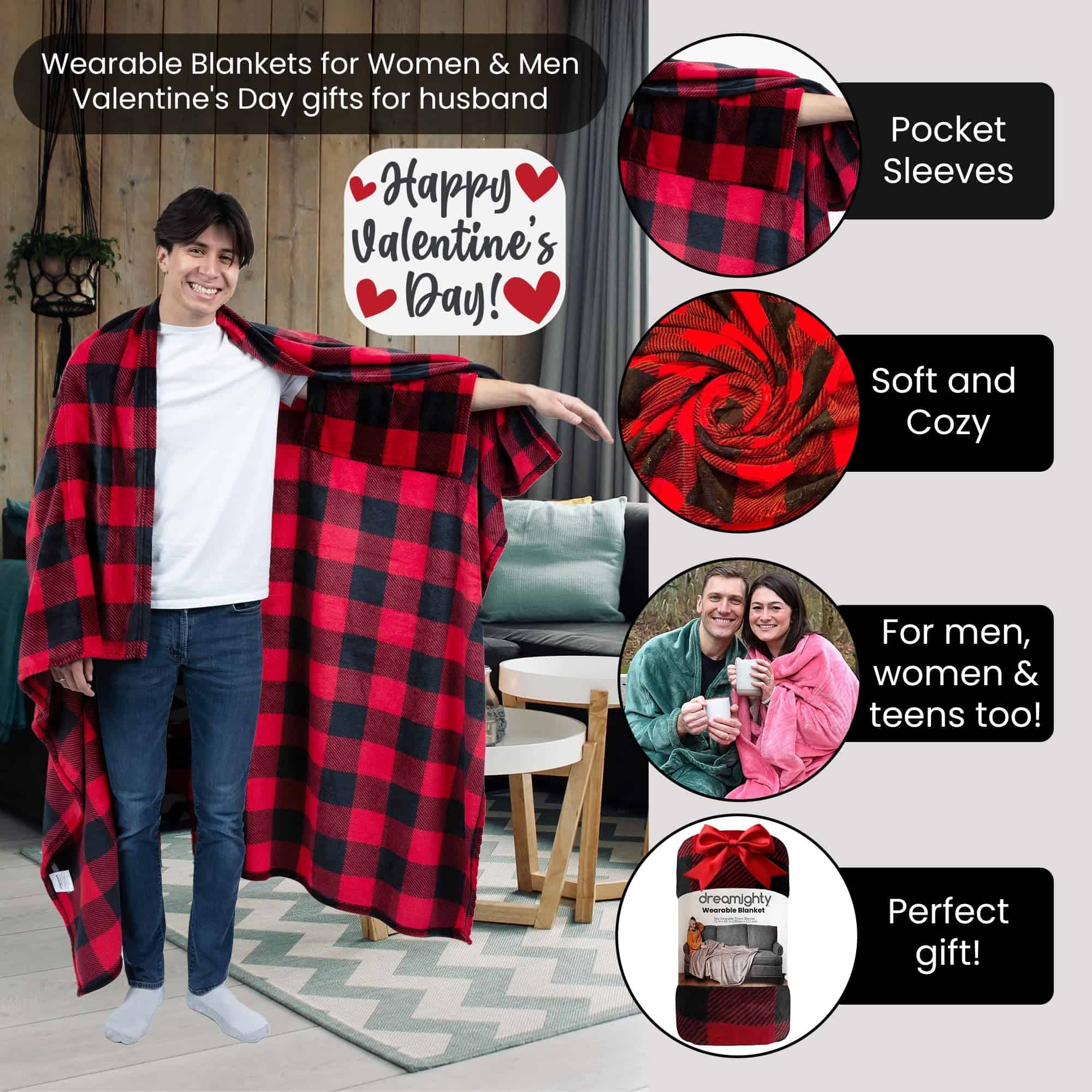1. Mangas de Bolsillo Únicas: Manténte acogedor con las mantas portátiles de Dreamighty, la manta definitiva para ella que puede ser una manta-ropa y suéter manta. Diseñada con mangas de bolsillo y agujeros para los brazos, y regalo de San Valentín perfecto para hombres y mujeres.