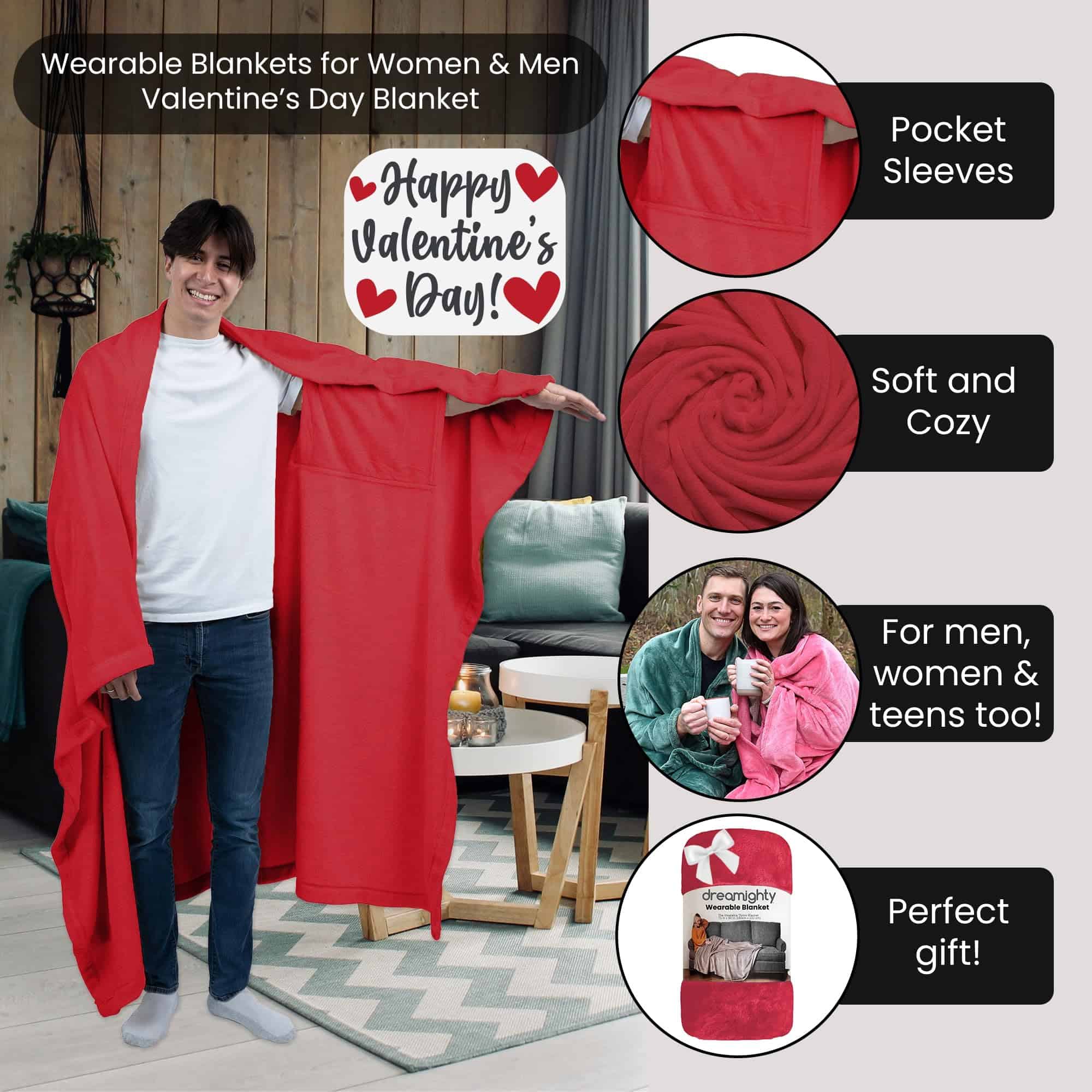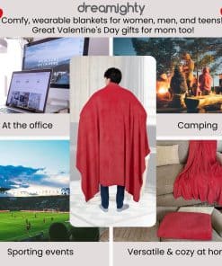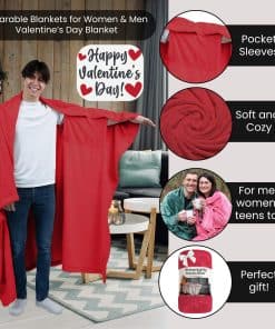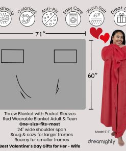 Manta portátil para adultos con mangas en color rojo, la solución perfecta para mantenerse acogedor y cómodo en todas partes. Con bolsillos únicos para las manos y agujeros para los brazos, esta manta es el regalo ideal de San Valentín para tu esposa, novia, mamá o cualquier ser querido. Disfruta de la máxima comodidad con su tamaño extragrande de 71″ x 60″, perfecto para usar en el sofá, la cama o simplemente para calentarte en el regazo. Hecha de material super suave y esponjoso, esta manta de franela de felpa no solo es acogedora, sino que también es una adición elegante a la decoración de tu hogar. Llévala contigo a donde vayas, ya sea como manta con brazos, manta corporal o bata de manta, esta manta portátil es versátil y portátil. Un regalo ideal para ocasiones especiales como cumpleaños, Día de la Madre o simplemente para demostrar amor y cariño. ¡Comparte el regalo de la comodidad con todos los que aprecian la calidez y el afecto de una manta portátil de alta calidad!