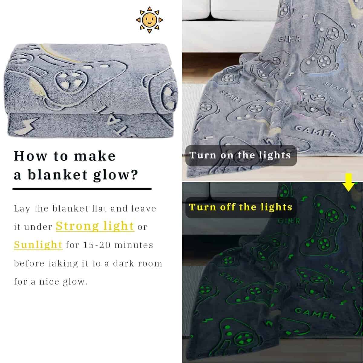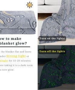 Divertida manta que brilla en la oscuridad, simplemente expónla a la luz solar durante 15 minutos y brillará durante más de 6 horas. Ideal para niños, suave y acogedora. Perfecta para usar en casa, en la cama, de vacaciones, en el auto, de camping o para una noche de cine. Un regalo pensado para los niños que no solo es cálido y suave, sino que también tiene una función de brillo divertida que les encantará. Transforma la habitación en un mundo de fantasía brillante cuando llega la noche. Puede lavarse a máquina en frío y secarse a baja temperatura sin perder calidad.