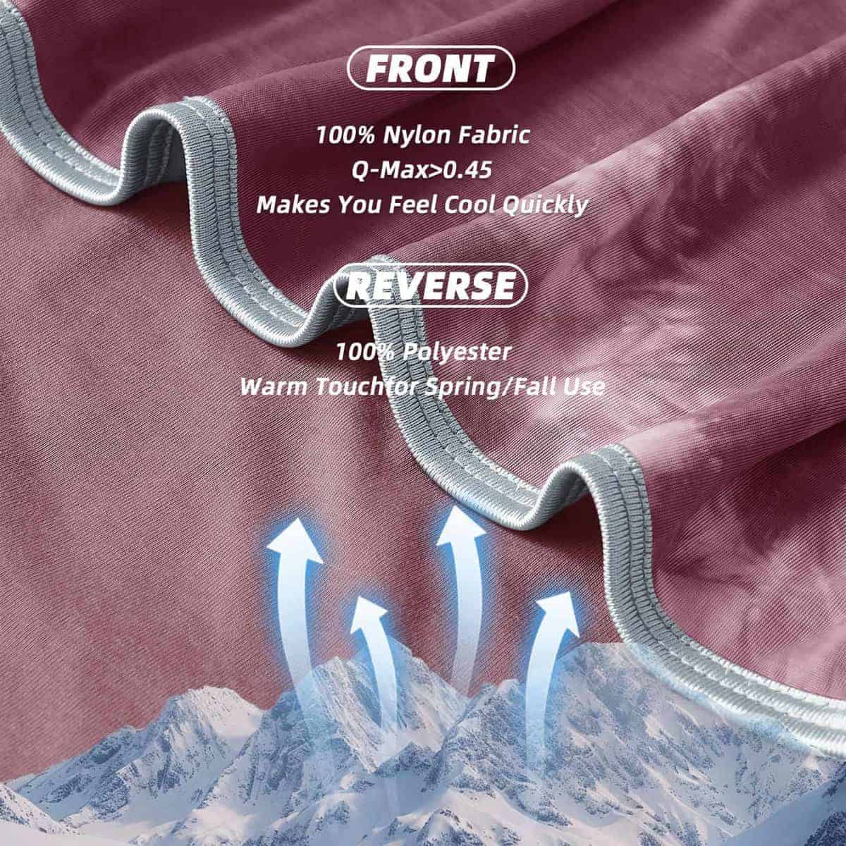 COOLING AND BREATHABLE: The front side of the cooling throw blanket is 100% cooling nylon fabric enabling hot sleepers to stay drier and cooler. The reverse side crafted with high-performance breathable blanket materials ensures year-round comfort. Oeko-tex standard 100 certified means you can confidently sleep under cold blankets for sleeping directly against your skin, enjoy ice blanket blending of softness, skin-friendliness, breathability, and soothing qualities.