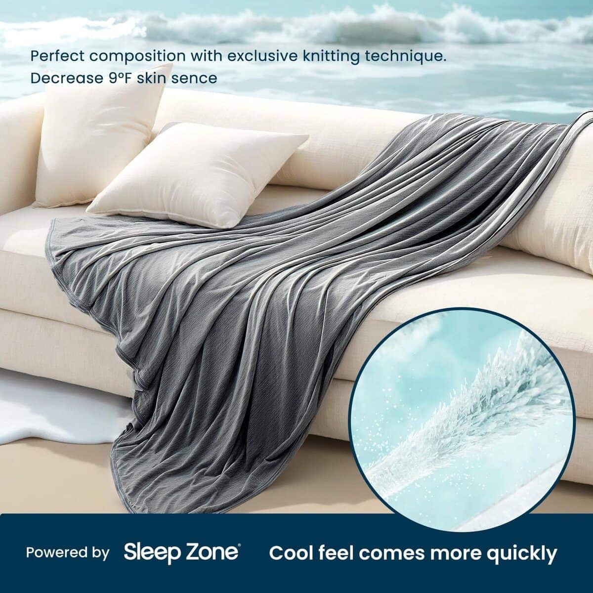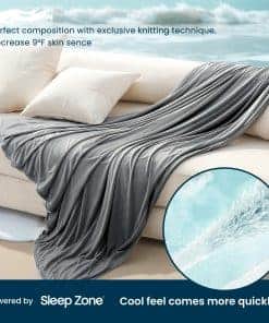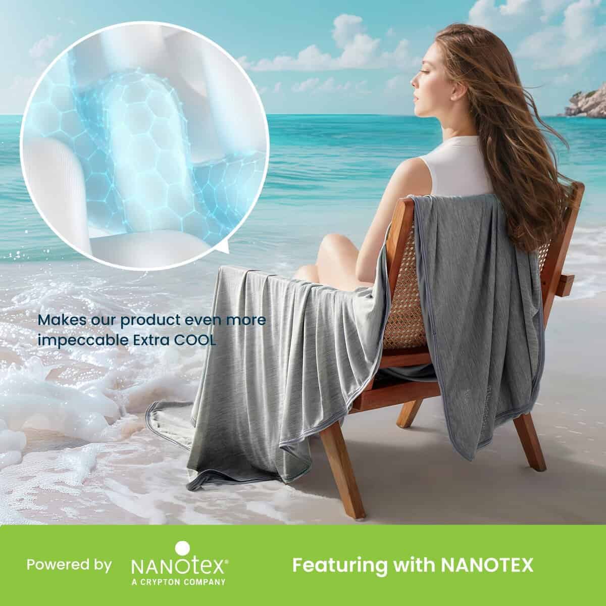 1. Mantente fresco toda la noche – Esta manta refrigerante, que cuenta con la nueva Tecnología NANOTEX Coolest, ofrece propiedades que absorben la humedad y se secan rápidamente diseñadas específicamente para las personas calurosas. Con avanzado nylon de mica y un Q-Max>0.5, nuestras mantas absorben el calor corporal de manera eficiente, manteniendo la temperatura de tu piel agradablemente baja incluso en las noches más calurosas del verano. Di adiós a los sofocos nocturnos y los calores repentinos mientras te sumerges en un capullo de frescor refrescante.