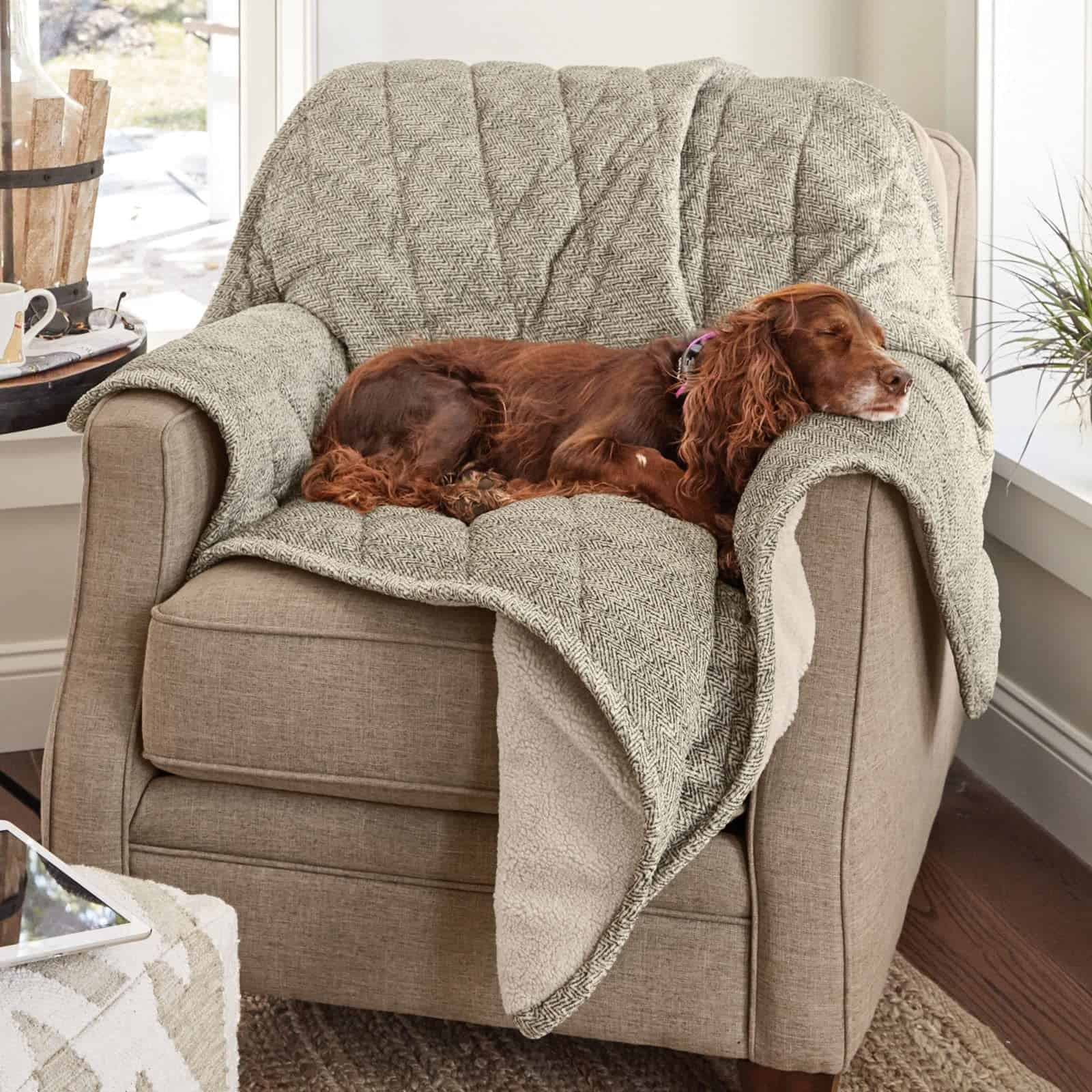 La manta de felpa Orvis Berber reversible proporciona comodidad y calidez en cualquier lugar. La tela de tapicería de calidad en un lado y la felpa de alto pelo Berber en el reverso satisfacen todos los gustos. El relleno de poliéster hilado de alta calidad crea un acolchado acogedor que usted y su perro adorarán. Duradero en su construcción, esta manta de fácil cuidado es una forma inteligente de mantener los pelos de mascotas y la suciedad fuera de su silla favorita. Poliéster. Lavable. Importado. Tamaño Mediano 48″W x 56″L, Grande 52″W x 72″L