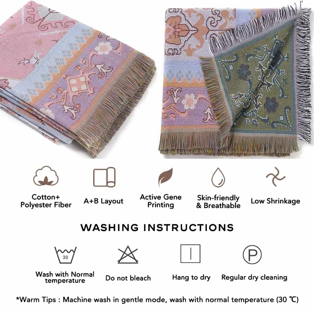 La manta está hecha de una estructura de algodón y poliéster de alta calidad para proporcionar comodidad duradera, que es respetuosa con el medio ambiente y texturizada. Al mismo tiempo, el proceso de tejido permite que la manta del sofá tenga una mejor transpirabilidad. El tamaño de las mantas es de 63 x 51 pulgadas, que podría satisfacer tus diversas necesidades. Por favor, mide antes de comprar.