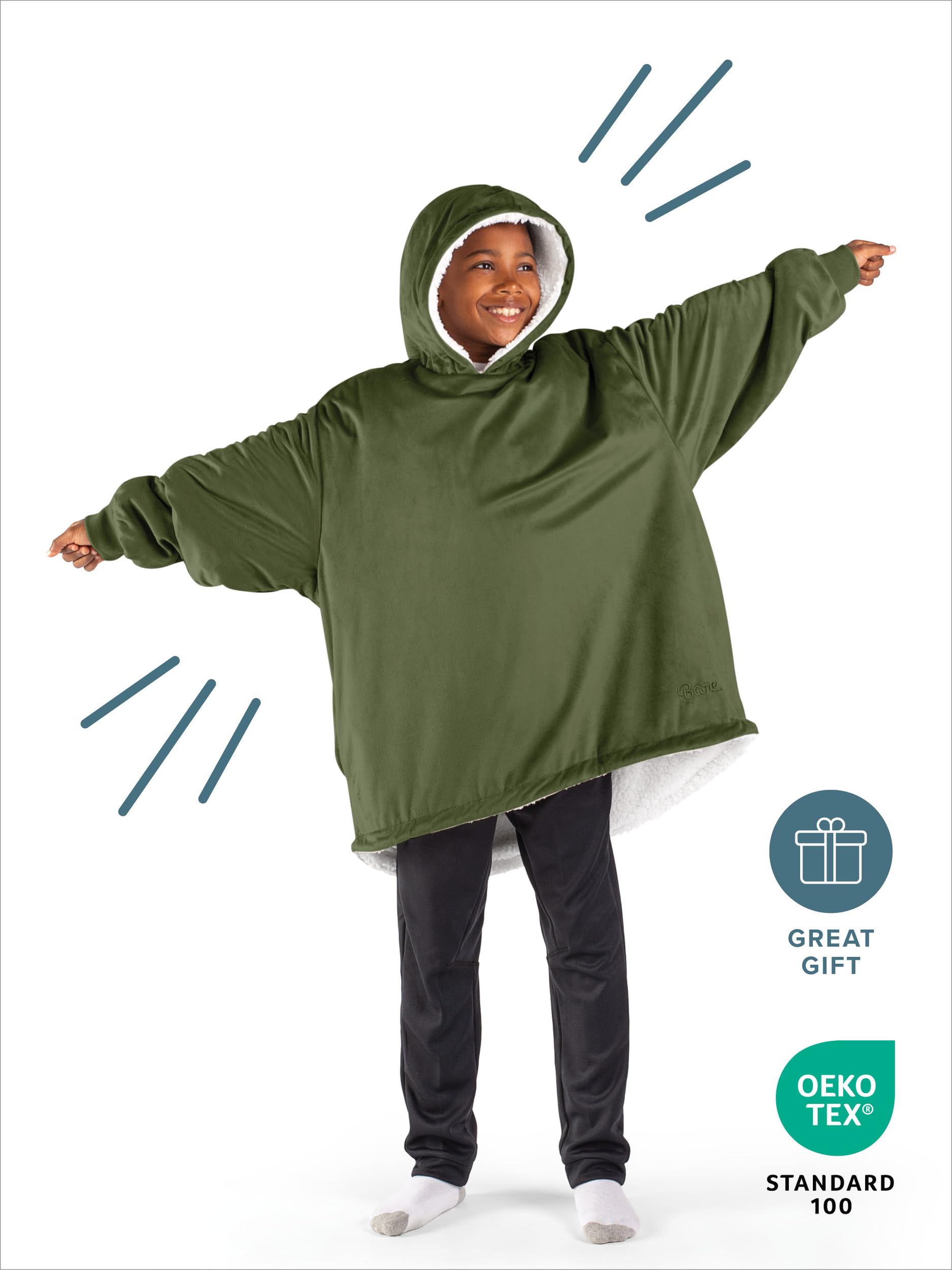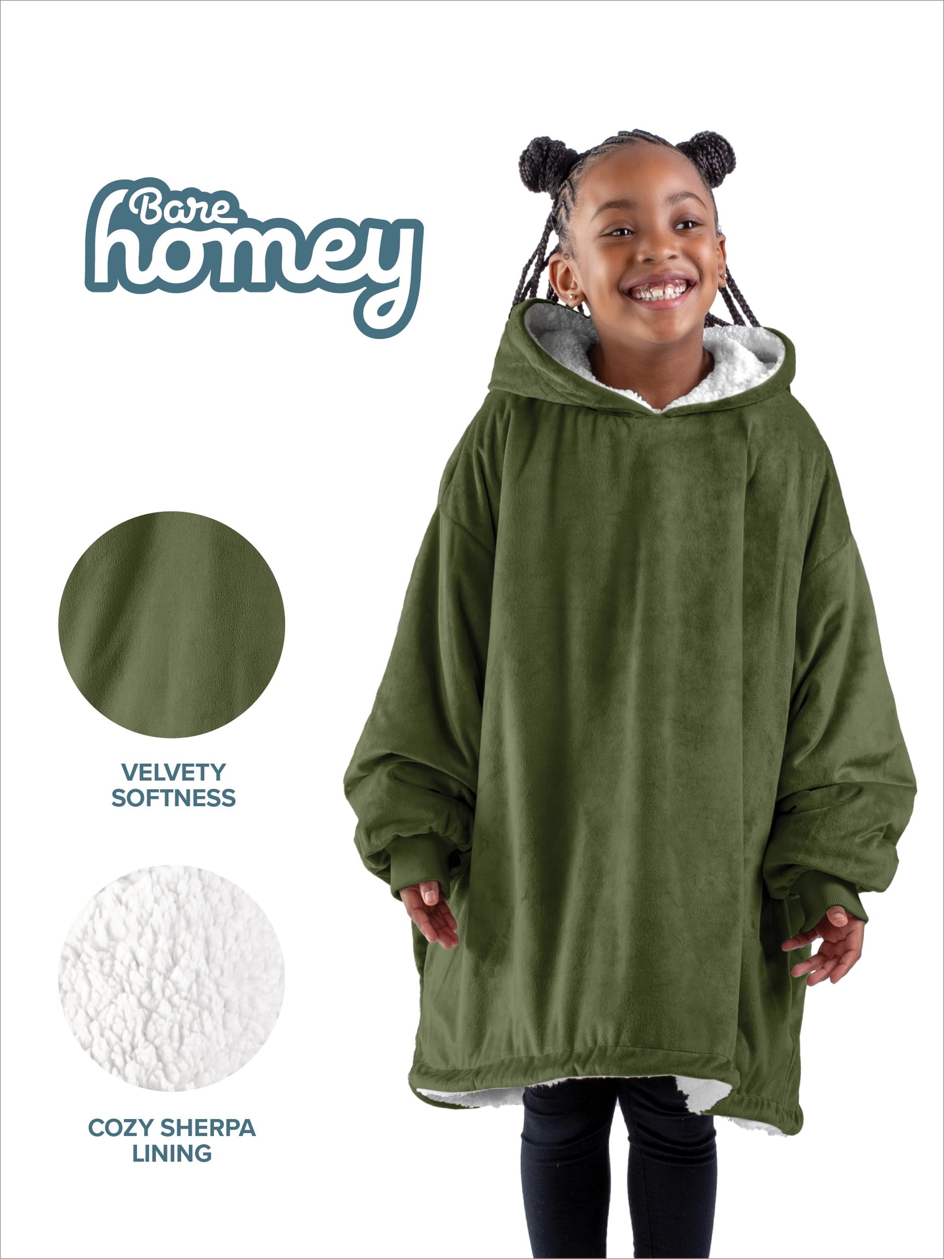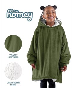 1. EL BARE HOMEY: ¿Es una sudadera con capucha extragrande, una chaqueta de manta o una manta con capucha? Llámalo como quieras, ¡es un multiusos! Si sueles tener frío, Homey es la solución para ti! Disponible en talla infantil: (28″ de ancho x 28″ de largo con una longitud de manga de 24″).
