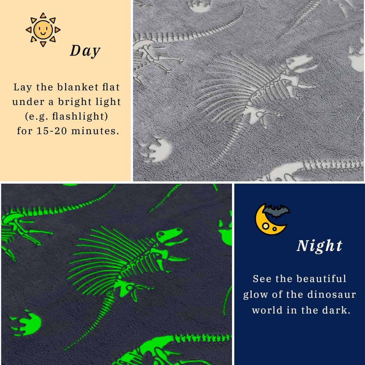 Esta manta de dinosaurios suave y acogedora es perfecta para niños y adultos por igual. Con su diseño que brilla en la oscuridad, ofrece una sensación única de suavidad y comodidad. Puede usarse durante todo el año, manteniéndote caliente en invierno y fresco en verano. Además, su tamaño de 50″ x 60″ la hace ideal para usar en la cama, sofá o llevarla al aire libre para picnics o camping. La manta que brilla en la oscuridad crea un ambiente mágico en la habitación una vez que se expone a la luz durante unos minutos. El color neutro y cálido es adecuado tanto para niños como para niñas, convirtiéndola en el regalo perfecto para cualquier ocasión. Añade diversión y calidez a tus noches con esta increíble manta de dinosaurio que brilla en la oscuridad.