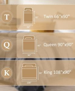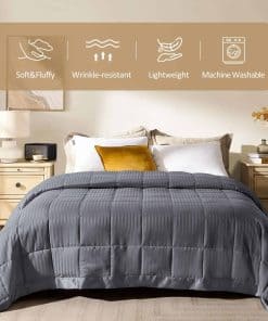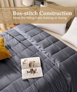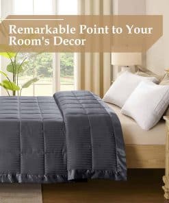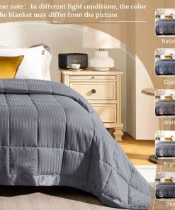Nuestra manta adopta un diseño de jacquard de rayas rectas con un ribete de satén de 3 pulgadas, perfecto para exhibirse en tu cama. La suave cubierta de piel de melocotón y el relleno de plumón alternativo de 135 GSM te mantienen cómodo. La manta adopta un relleno de polifila premium, esponjoso y bien distribuido, sin preocupaciones por apelmazamiento u olores desagradables. El tejido es resistente a las arrugas, muy suave y transpirable. Hecho con tecnología de costura en caja, asegura el relleno en su lugar, sin preocupaciones por fugas de relleno o hilos sueltos. El remate es exquisito y duradero. Tamaño King – 108 por 90 pulgadas. Nuestras mantas vienen en una variedad de colores para adaptarse a las necesidades de diferentes personas. Estas son excelentes opciones para tu familia o amigos en ocasiones especiales. Fácil de cuidar: lavar a máquina en agua fría en ciclo suave, y simplemente secar al sol o secar en secadora con calor bajo. Nos comprometemos a proporcionar productos de calidad y responder cualquier pregunta que puedas tener sobre el producto.