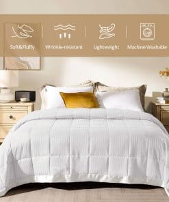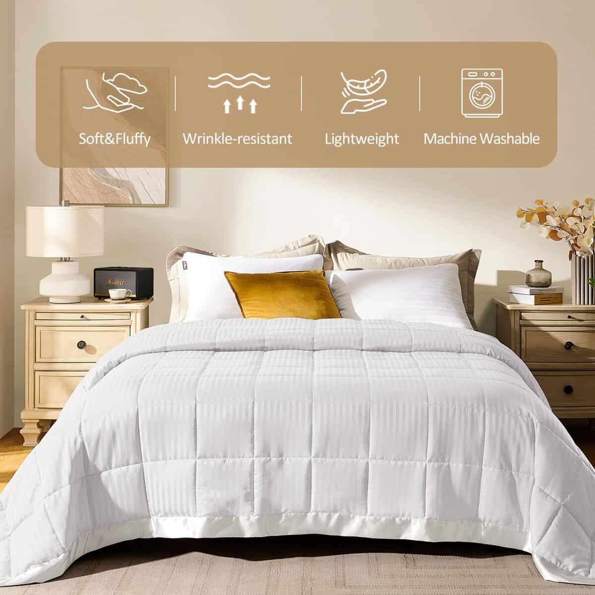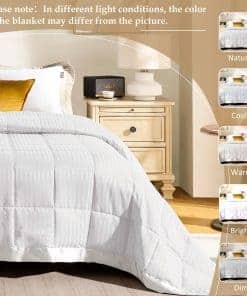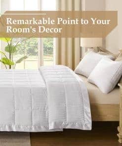 Manta Tamaño Queen downluxe con Ribete de Satín es la opción perfecta para mantenerse cómodo durante todo el año. Con un diseño único de jacquard de rayas rectas y ribete de satín de 3 pulgadas, esta manta es perfecta para exhibirla en tu cama y añadir un toque de elegancia a tu habitación. La suave cubierta de piel de melocotón y el relleno alternativo de 135 GSM mantienen la calidez sin sacrificar la comodidad.