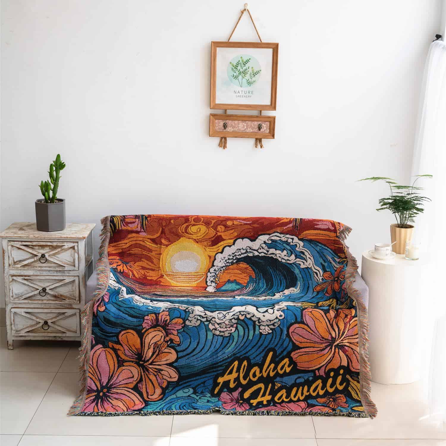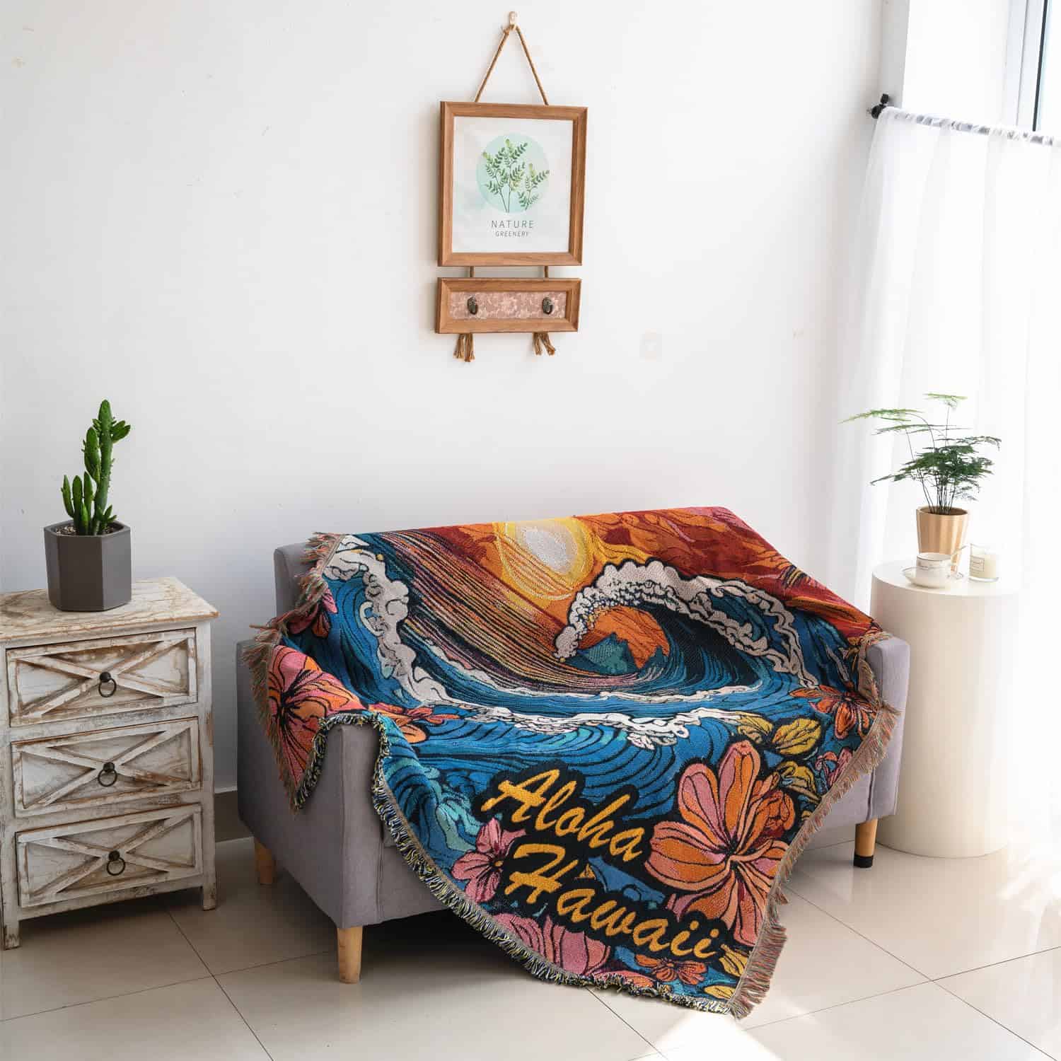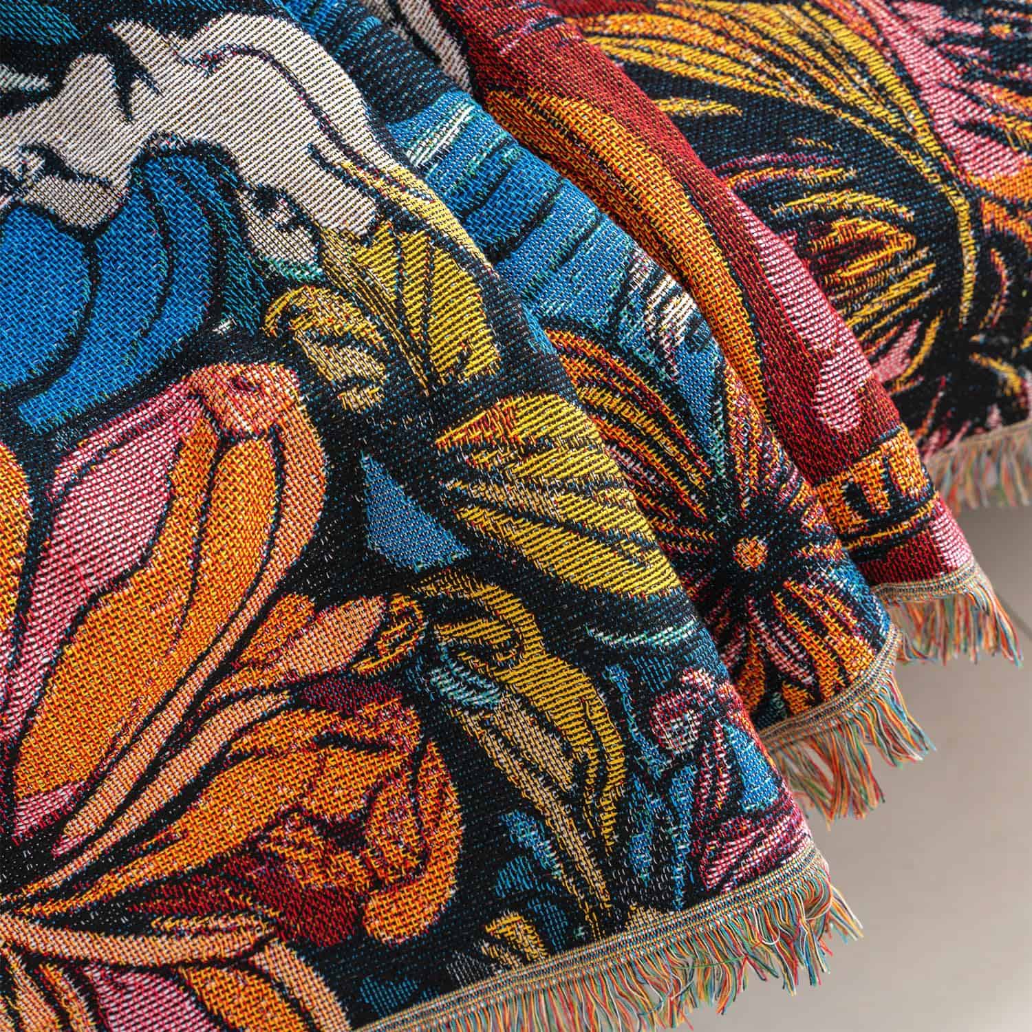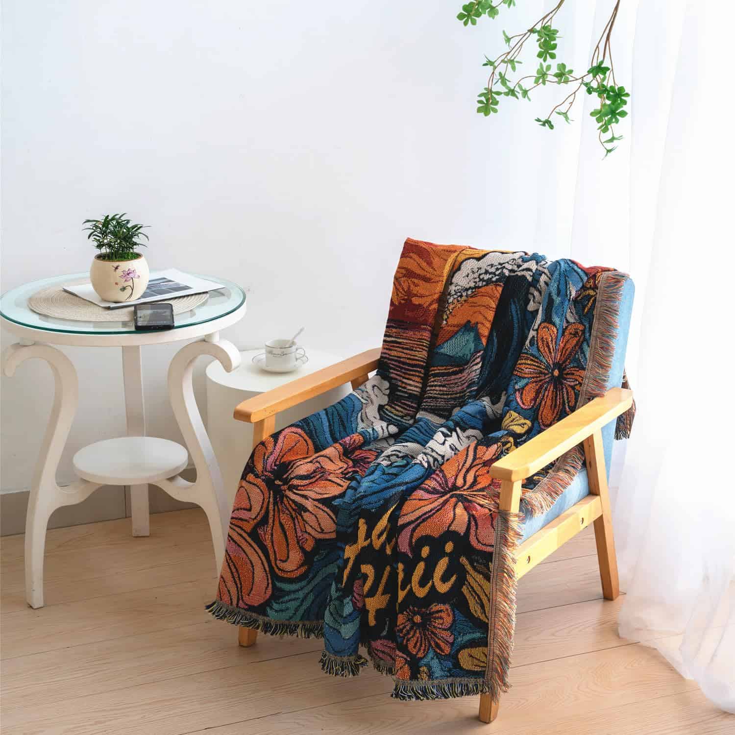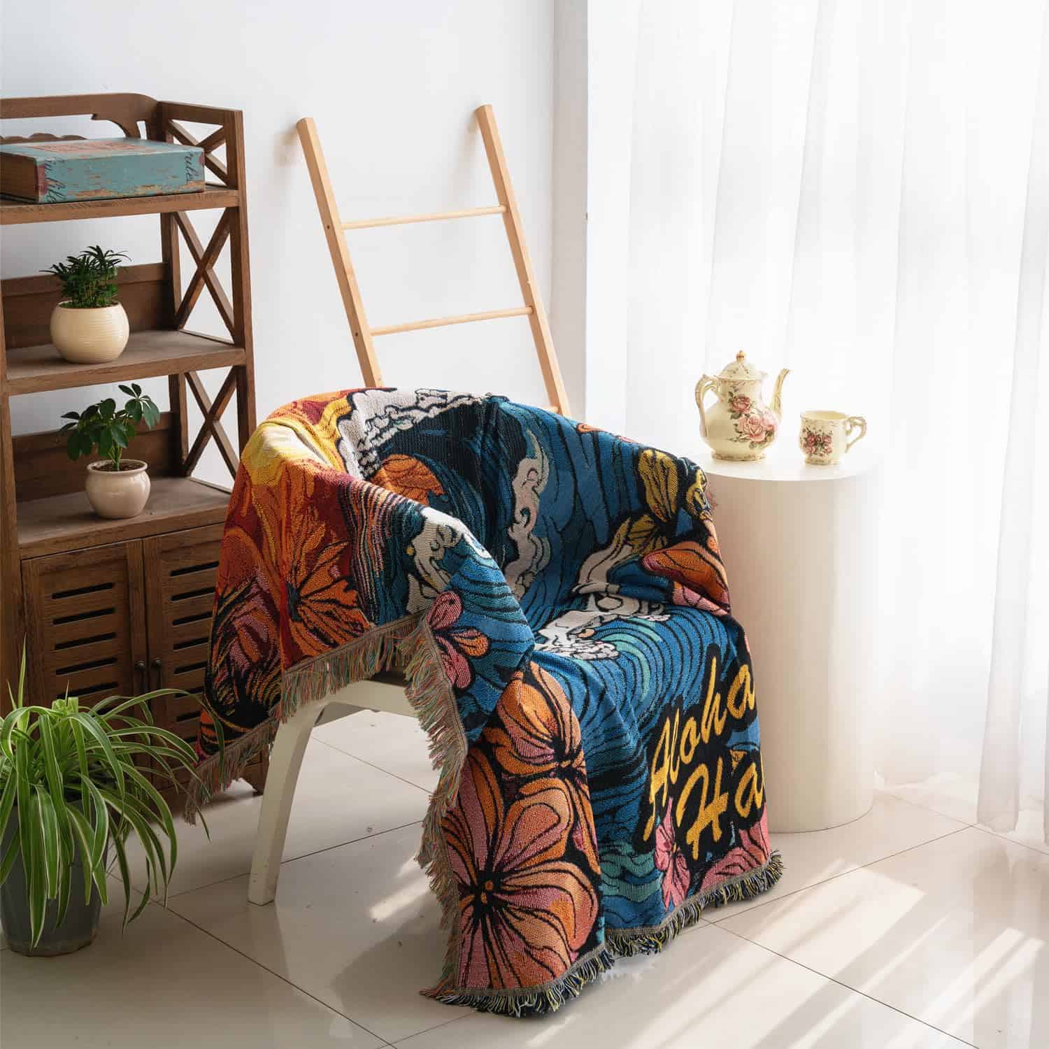 Manta tejida con borlas de doble cara en mezcla de algodón y poliéster. Decorativa, elegante y ecológica, sin sustancias nocivas como el formaldehído. Ideal para usar en sofás, camas, tapices, mantas de camping, entre otros. Instrucciones de cuidado: lavar a máquina a 30-40°C, secar a temperatura baja o al aire, no usar lejía, planchar tibio si es necesario.