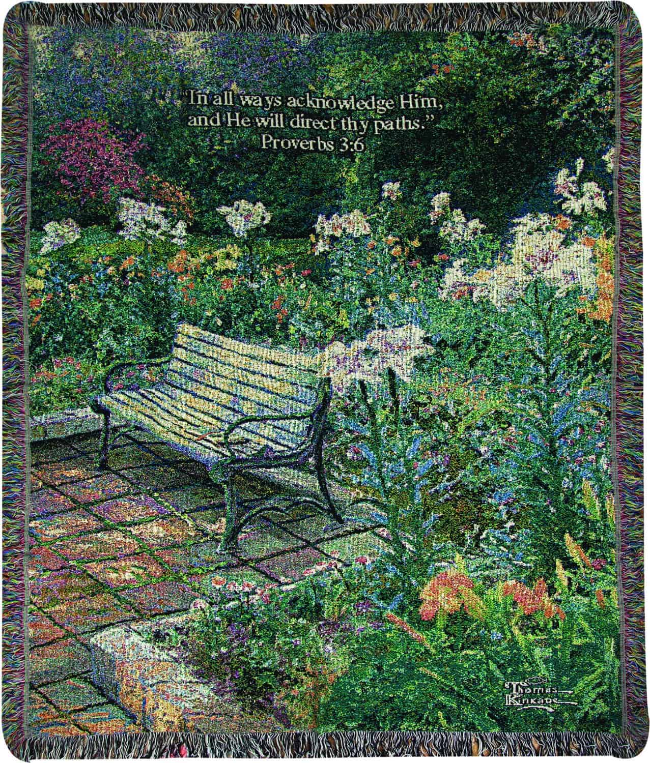 Generosamente de 50 x 60 pulgadas, esta manta tejida puede cubrir una cama, colocarse sobre un sofá o adornar una silla cómoda. El diseño Eternal Springtime Proverbs 3:6 de Thomas Kinkade está tejido jacquard con algodón y mezcla de hilos en un telar. Aunque Thomas Lemuel Oates comenzó Manual Woodworkers and Weavers en 1932, la historia se remonta aún más atrás. Las raíces de la empresa se encuentran en el espíritu emprendedor de Oates. Él y su hermano solían cultivar las montañas de Bat Cave en el oeste de Carolina del Norte, ayudando a su madre a encontrar materiales para sus artesanías. Los hijos comenzaron a hacer silbatos de madera, cubos y casas para pájaros y vendían sus productos, junto con las artesanías de su madre, a las personas de Charlotte que pasaban en carros tirados por caballos camino a las montañas. Más tarde, Thomas trabajó en la Ashville Postcard Company, donde aprendió sobre el negocio mayorista. Cuando llegó la Depresión, perdió su trabajo, pero lo inspiró a iniciar su propio negocio y vender artesanías, como muñecas de maíz y tejidos, producidos por las mujeres locales. Construyó una rueda de agua para generar electricidad en un molino, empezó a fabricar productos y abrió una tienda. Con los años, expandió la empresa. Su hijo, Lemuel Oates, trabajó en el negocio desde muy joven y se encargó de la empresa. Explica que los productos estaban hechos con retazos de algodón que sobraban de la fabricación de calcetines; círculos de medio pulgada se unían para formar una variedad de productos. Lemuel Oates fue a la universidad y luego se instaló en Richmond. En diciembre de 1973, regresó a Bat Cave y tomó el control de la empresa. En 2007, su hijo Travis y su hija, Molly Oates Sherrill, se hicieron cargo del negocio.