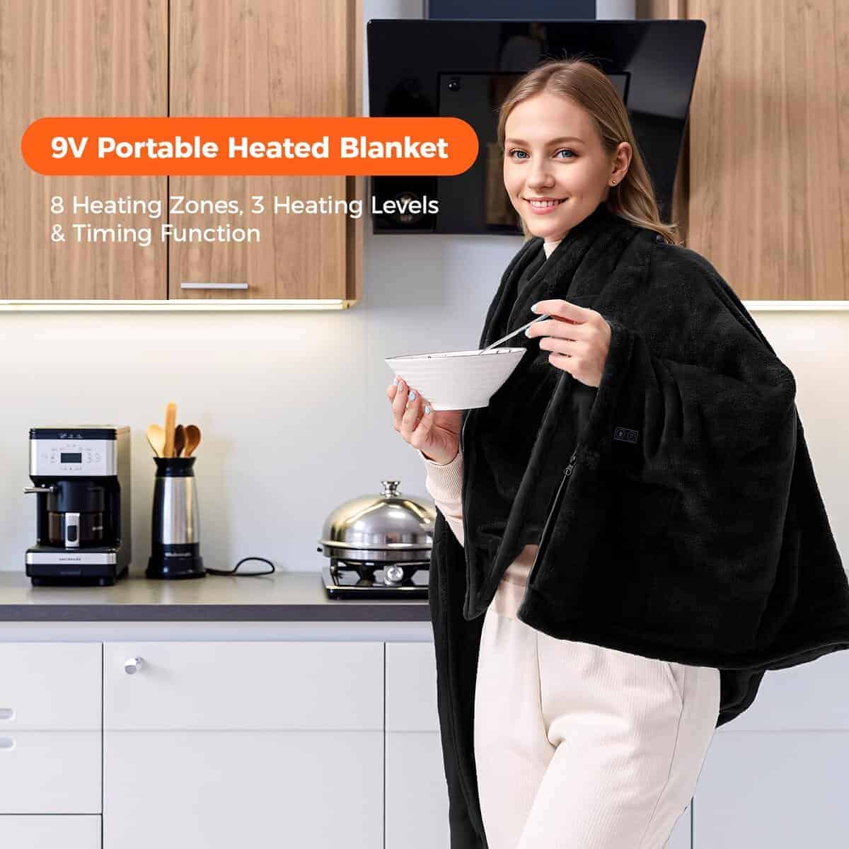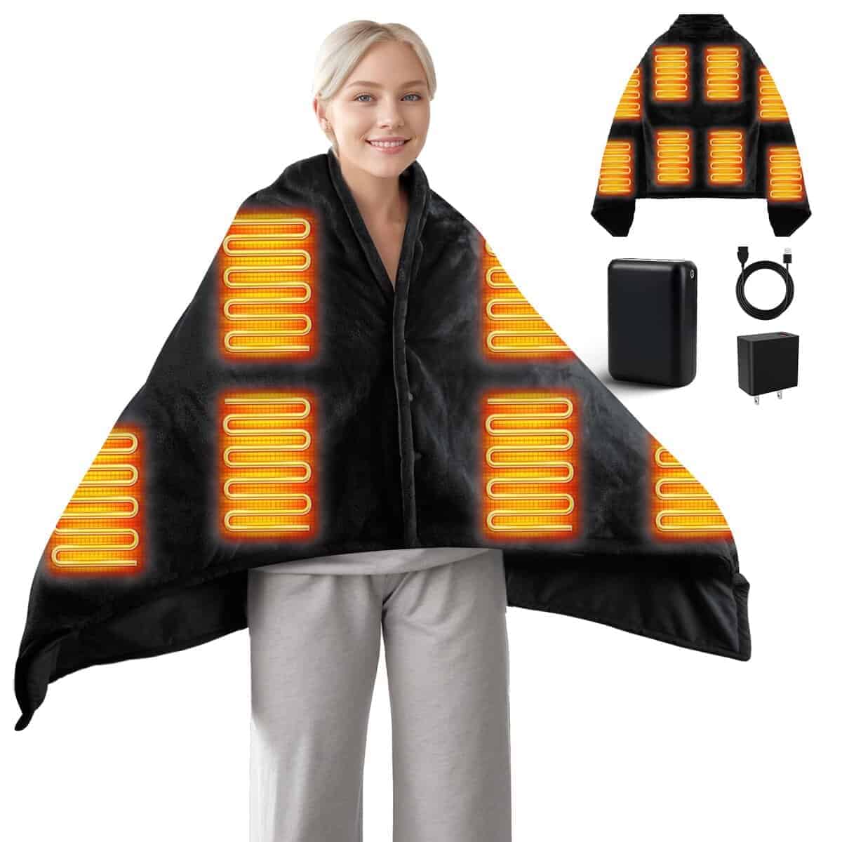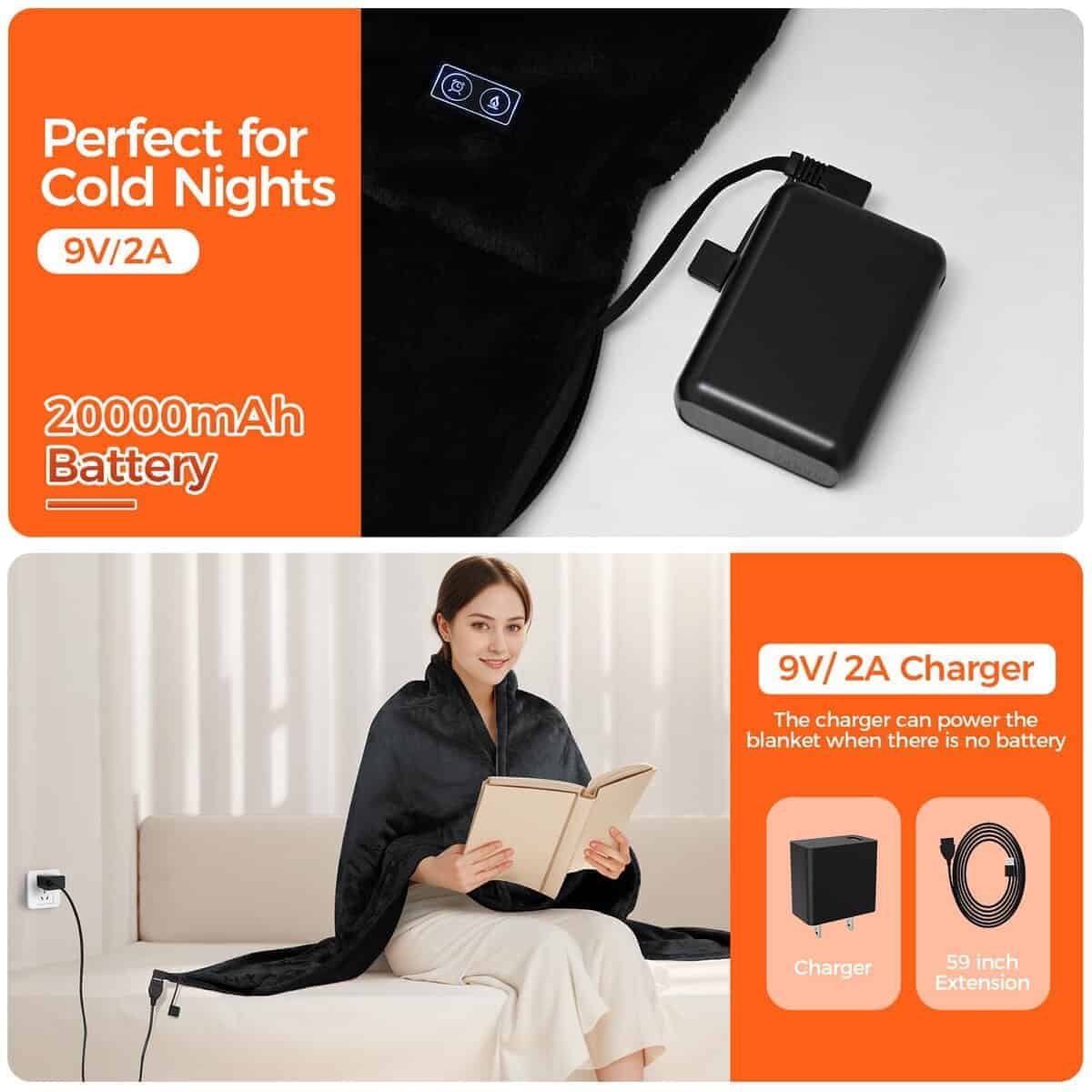Manta térmica portátil con batería de 20000mAh, manta térmica inalámbrica con 8 zonas de calentamiento, 3 niveles de calor y función de temporizador que puede calentarse rápidamente. Perfecta para exteriores, camping, pesca y ver juegos deportivos. La manta eléctrica también se puede utilizar para aliviar el estrés, mejorar la circulación y ayudar con problemas de sueño. Lavable a máquina con franela suave y resistente, resistente a manchas y decoloración. El paquete incluye una manta térmica inalámbrica de 55.11» x 34.25», batería recargable, cargador, cable tipo C, cable micro de extensión y bolsa reutilizable. Regalo perfecto para familiares y amigos en ocasiones especiales como Acción de Gracias, cumpleaños y Navidad.