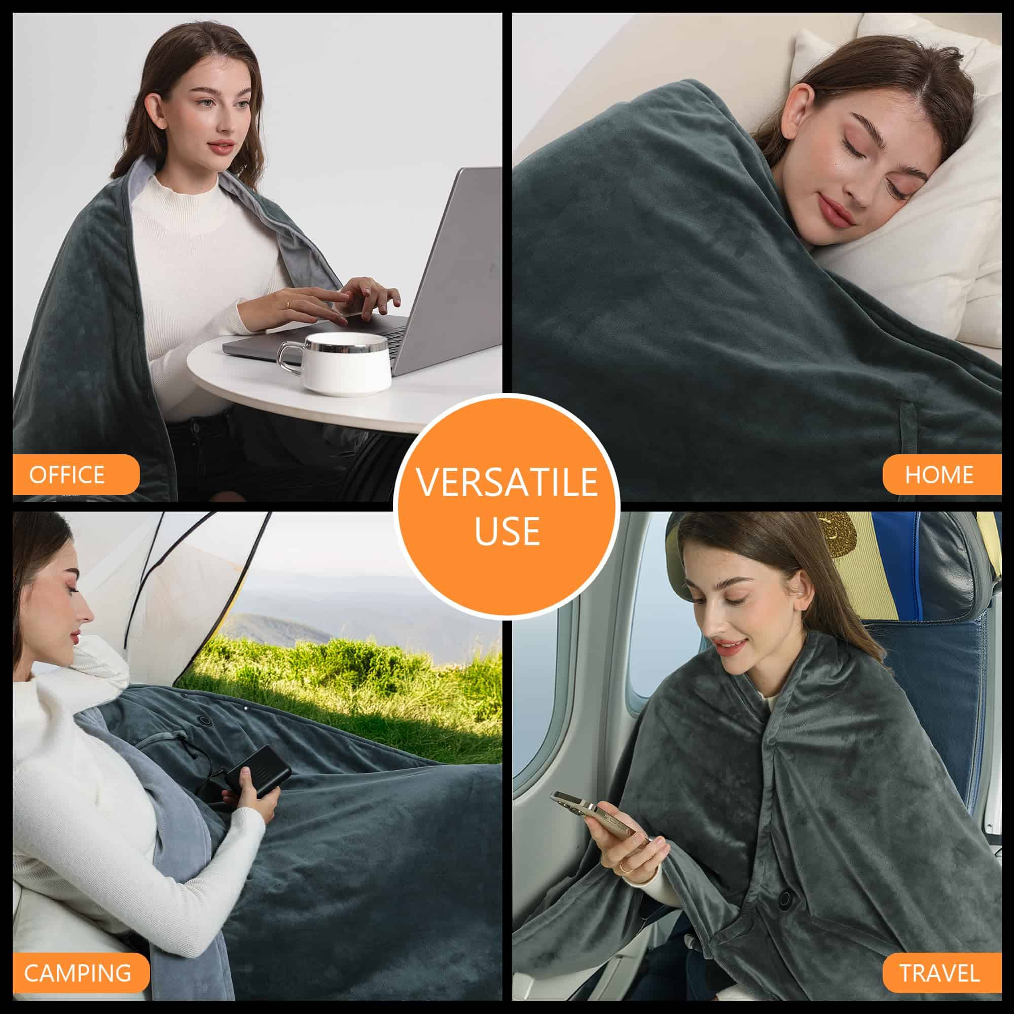 4. Uso versátil: Esta manta térmica con batería ligera y portátil es versátil y fácil de llevar. Ya sea en interiores viendo la televisión o trabajando en la oficina, o al aire libre acampando, viajando o haciendo senderismo, esta manta térmica portátil es tu compañera ideal. Puedes ponértela en cualquier momento, permitiendo libertad de movimiento sin estar limitado por la ubicación.