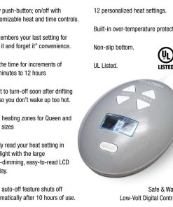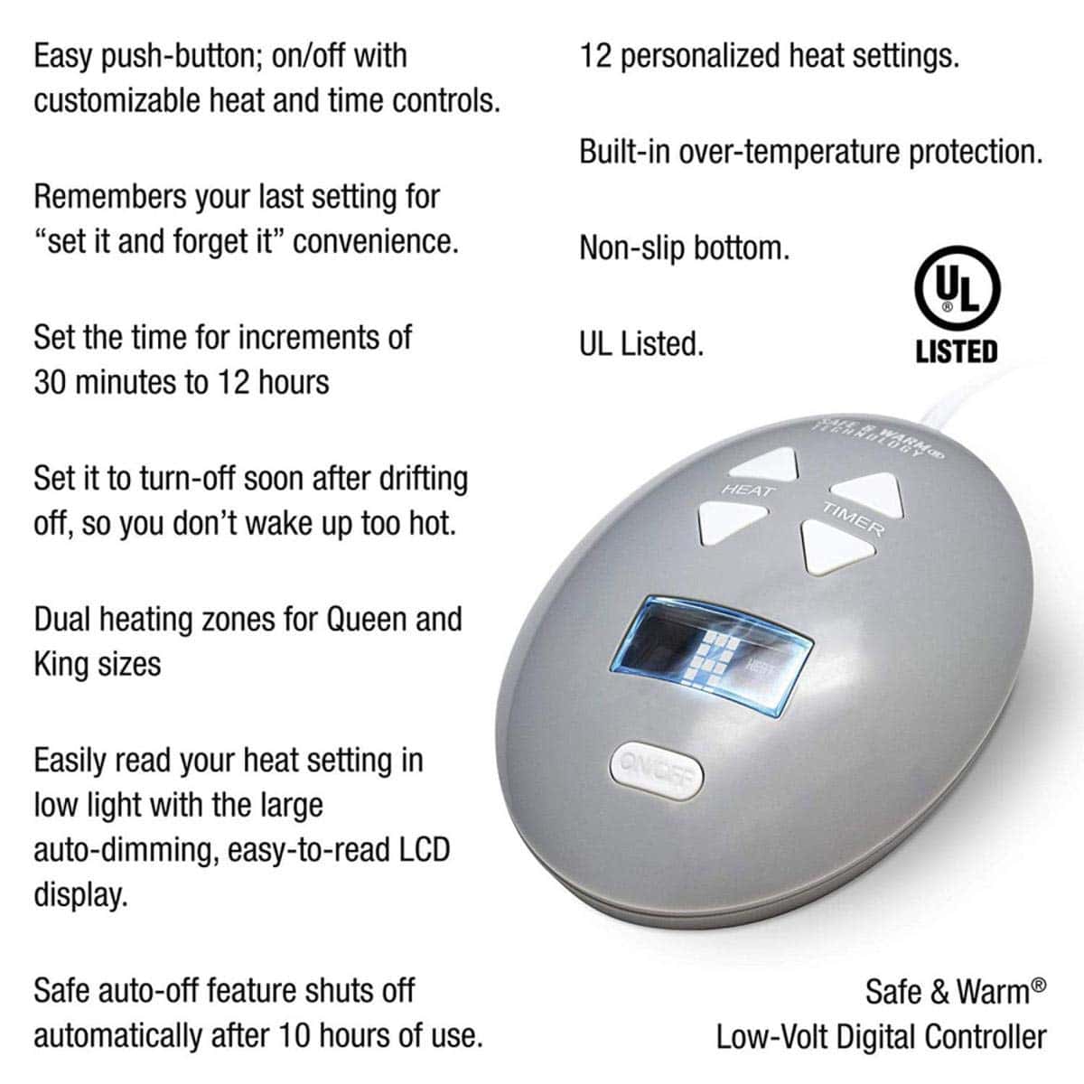Para la máxima comodidad térmica, Soft Heat está introduciendo una nueva manta de terciopelo plush con un controlador digital. Fácil de usar, este controlador ahora le permite programar el tiempo de calentamiento así como la temperatura perfecta. Este controlador también recuerda su última configuración, por lo que una vez que haya encontrado la temperatura y el tiempo perfectos, un simple clic del botón de encendido lo enviará al país de los sueños. Esta manta tiene la misma tecnología patentada Safe and Warm de bajo voltaje en la que usted ha venido confiando. Nuestra tecnología patentada de bajo voltaje es la única tecnología de manta eléctrica certificada como no peligrosa. El lujoso tejido de terciopelo es suave contra la piel, los alambres virtualmente invisibles y la tecnología segura de bajo voltaje significan que estará durmiendo en el paraíso esponjoso con ‘la manta eléctrica más segura del mundo’.