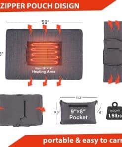 4. Portátil, Ligero, Compacto: La manta térmica portátil alimentada por USB viene en un cojín compacto con cremallera, de tamaño solo 15.3 x9.5 x6 , con un peso de solo 1.5 lbs. Diseño ligero con cuerda para llevar, puedes llevarla a cualquier lugar. Uso conveniente al viajar, acampar o trabajar, sin más temblores con el frío. La manta térmica USB se pliega en 5 pliegues y luego se cierra con cremallera para mantenerlo todo en su lugar. Cuanto más la uses, más intuitivo será volver a doblarla en un cojín.