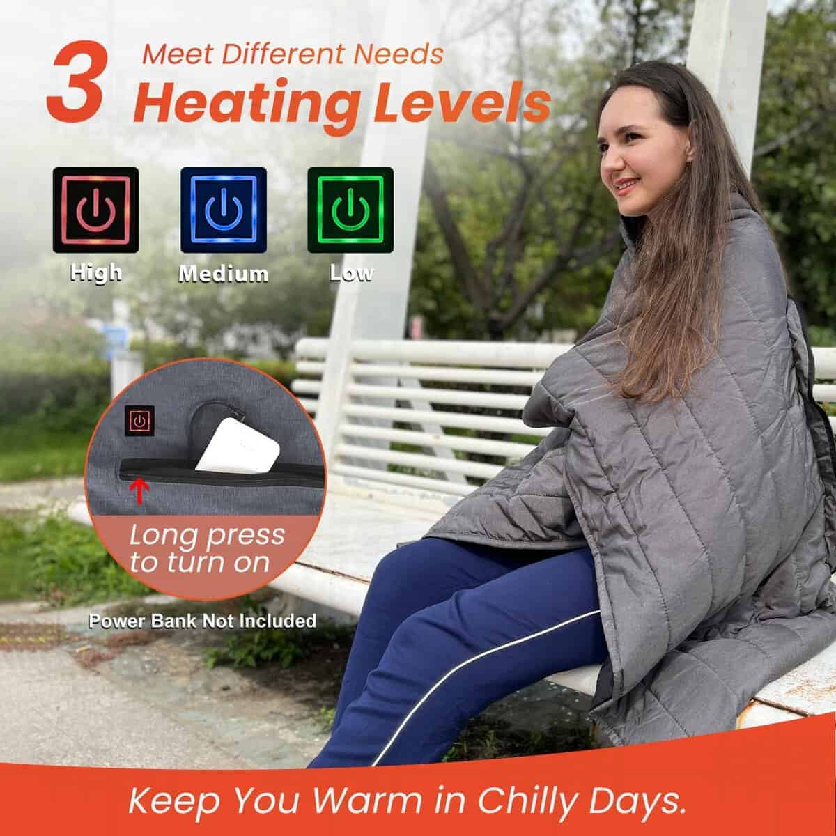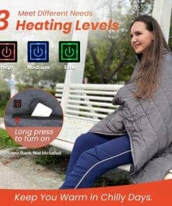 1. Cómodo, Cálido, Acogedor: Esta manta térmica portátil está hecha de tela súper suave, proporciona gran calor en la parte central, menos pérdida de calor y te mantiene caliente. Con tecnología de calentamiento actualizada, el puerto USB mejoró significativamente el efecto de calentamiento (batería no incluida). La manta térmica portátil se calienta en segundos, haciendo que estar al aire libre en otoño-invierno sea mucho más cómodo. Cuenta con 3 niveles de calor para satisfacer sus diferentes necesidades, simplemente presione el botón de encendido para cambiar.