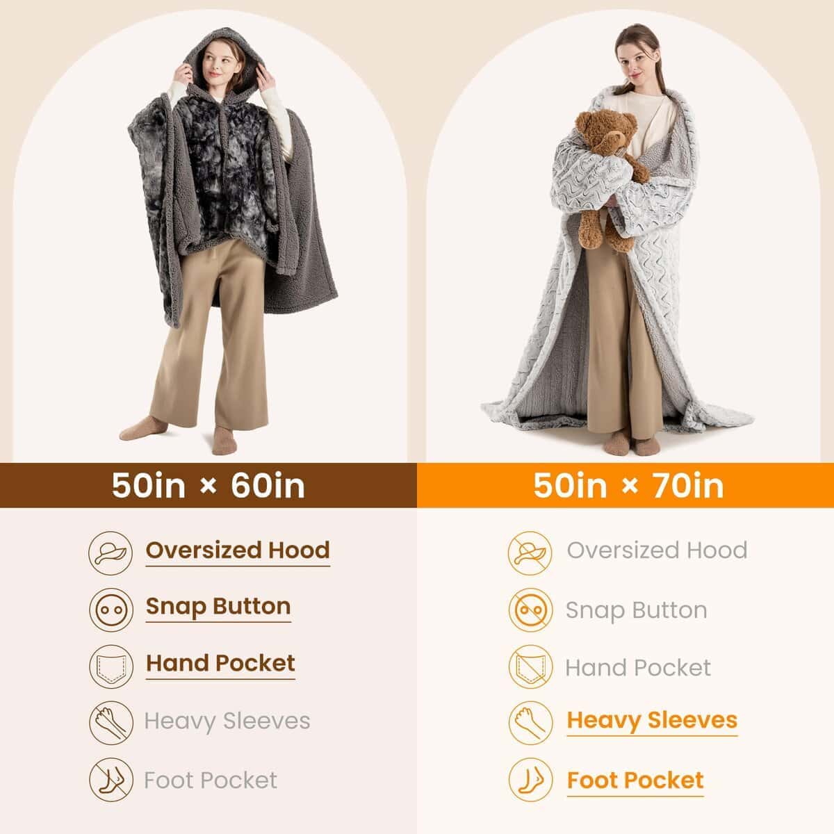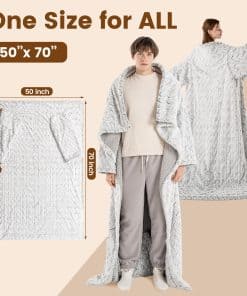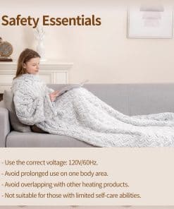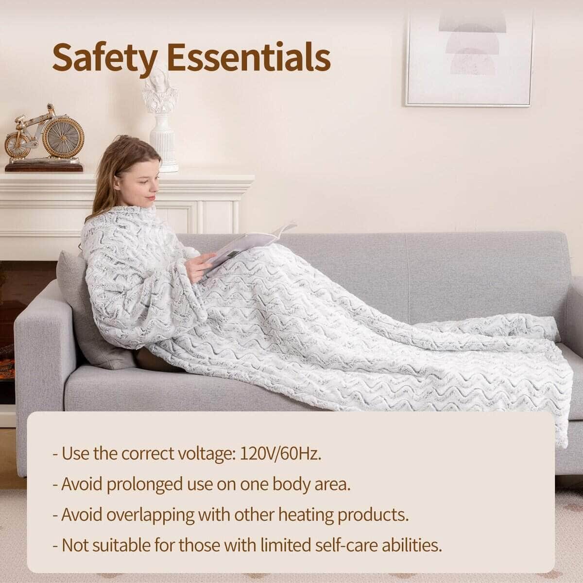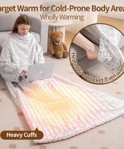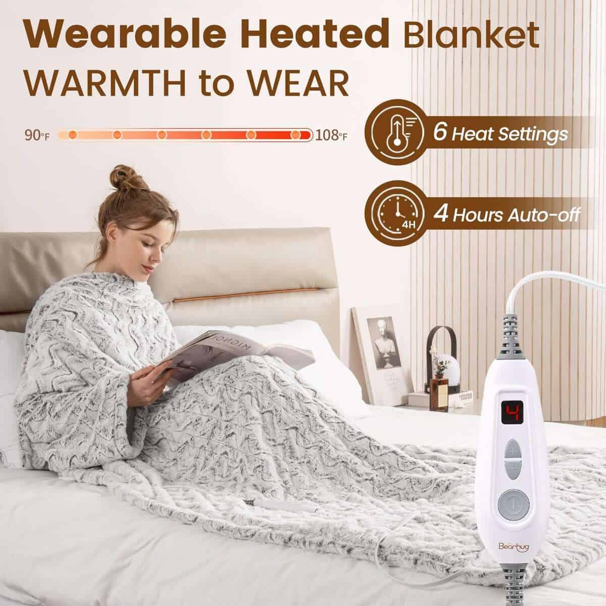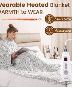 1. Bolsillos calefactables para los pies La manta térmica wearable Bearhug 50 70 + 18 combina elegante piel falsa con acogedora sherpa para ofrecer comodidad táctil y visual. Con bolsillos calefactables grandes para los pies y mangas gruesas para mayor calidez y comodidad. 2. Abrígate en cualquier posición La bata térmica Bearhug se calienta rápidamente con tecnología avanzada. Los cables densos pero discretos ofrecen calidez y confort. Envuélvete en el sofá, cúbrete en la cama o muévete libremente con su cable largo de 10 pies, elige la posición más cómoda con la manta térmica wearable de Bearhug. 3. Abrígate como un abrazo de oso Nuestra manta eléctrica abrazable Bearhug cuenta con 6 ajustes de calor (90 F-108 F) para una comodidad personalizada. Perfecto para regalar, viene en una caja de regalo especialmente diseñada y un diseño de talla única para todos. 4. Garantía de seguridad Nuestra manta térmica wearable abrazable viene certificada por ETL, con un temporizador de apagado automático de 4 horas y protección contra sobrecalentamiento para mayor seguridad. Función lavable a máquina para mayor comodidad. 5. Compra sin preocupaciones Si encuentras algún problema de calidad en los próximos 5 años, puedes contactarnos en cualquier momento. Tenemos un servicio de atención al cliente en línea las 24 horas del día, los 7 días de la semana que puede responder a tus preguntas en cualquier momento.