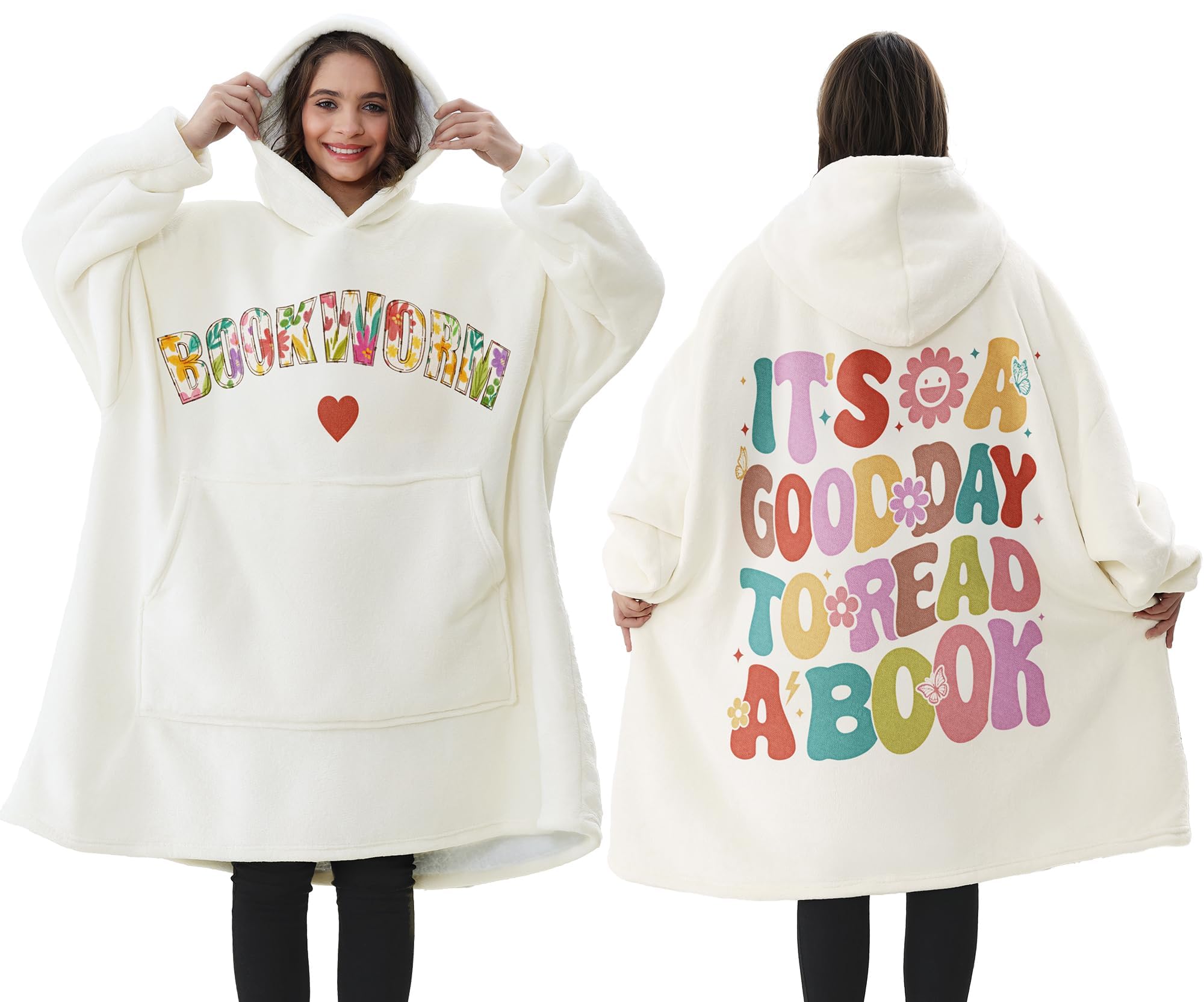 Manta con capucha y comodidad última: Esta manta con capucha presenta una doble capa de microfibra: felpa lisa con un suave forro de sherpa para mantenerse cálido y cómodo. Diseñado con mangas, el regalo cómodo para amantes de libros cubre totalmente los hombros y brazos, permitiendo moverse libremente mientras se mantiene acogedor. La capucha gigante de la manta con capucha ofrece calor extra para la cabeza. Puedes regalar este regalo a mujeres para brindarle calor y protección extra para el cuello y la cabeza, protegiéndola del viento.
