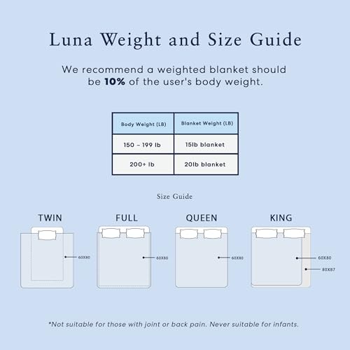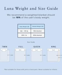 El patrón acolchado garantiza que el relleno de cuentas de vidrio se mantenga en su lugar, evitando que se agrupe o se acumule. El diseño inteligente de Luna distribuye el peso de manera uniforme, proporcionando una experiencia acogedora adaptada a su cuerpo. ¡Es el regalo perfecto para sus seres queridos! Disponible en tamaños de Niño, Gemelo, Individual, Queen y King, y pesos que van desde 10 lbs a 25 lbs, ¡hay una opción para Niños y Adultos! Consulte nuestras tablas de tallas y pesos para descubrir la manta pesada de algodón ideal para cualquier temporada. ¡Las mantas con pesas Luna son fáciles de cuidar! Para mantas de 15 lbs o menos, simplemente lávelas a máquina en frío en un ciclo suave o lávelas a mano, y cuélguelas para secarlas o séquelas a baja potencia si es necesario. Para mantas más pesadas de más de 15 lbs, le recomendamos que las lave a mano o las limpie solo en un lugar para garantizar una larga vida útil. Evite lavar a máquina y secar en secadora para evitar daños, ya que la mayoría de las máquinas solo pueden contener 10-15 lbs. Siempre consulte el manual del fabricante de su máquina para conocer la capacidad de peso. Luna ha sido líder en tecnología de sueño confortable desde 2015, ayudando a más de 5 millones de personas a dormir mejor. Los productos de Luna son investigados, desarrollados, diseñados en los EE. UU. y han sido presentados en The Today Show varias veces.