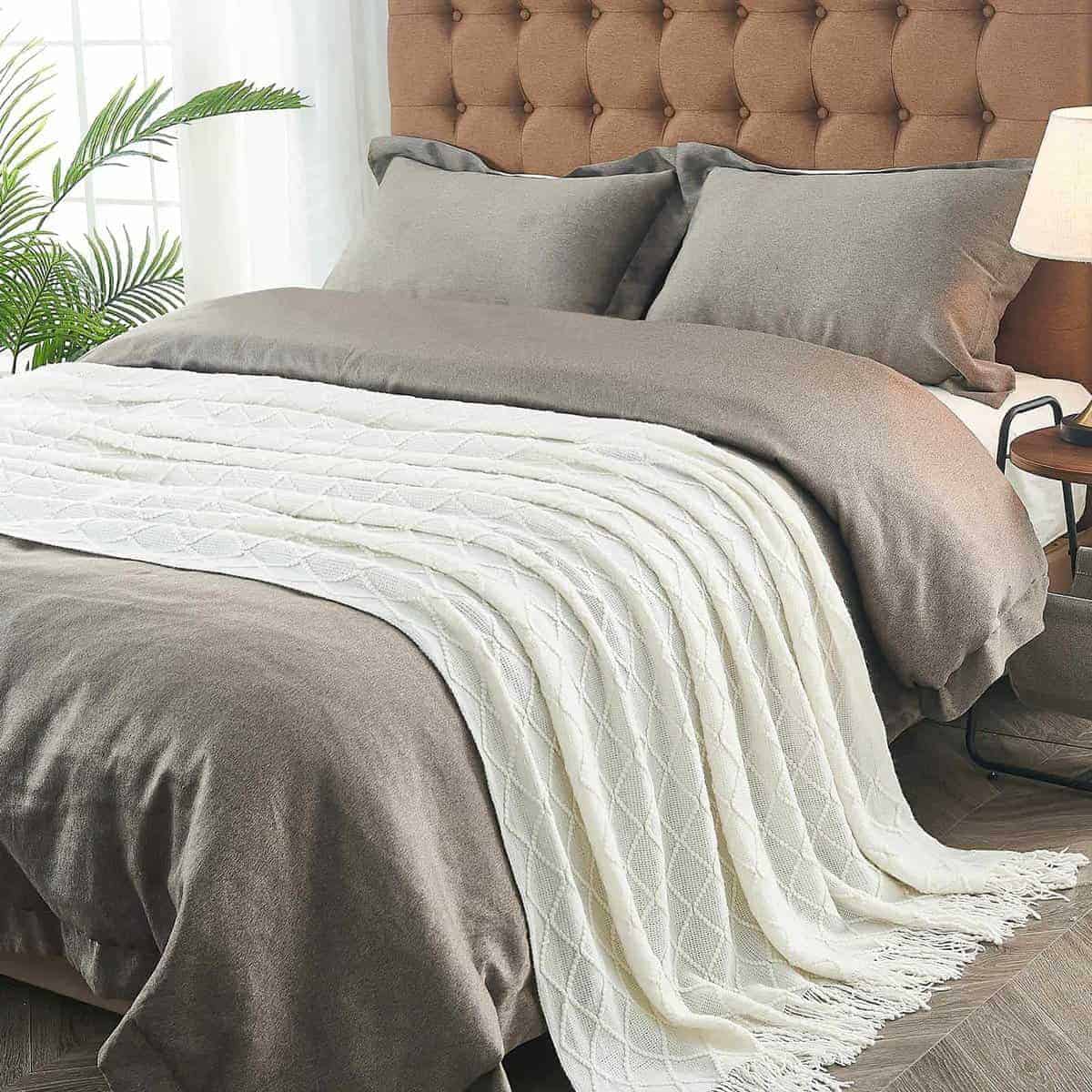 4. CUIDADO FÁCIL: Lavado por separado, ciclo suave y plancha baja son métodos comúnmente utilizados, que funcionan perfectamente para nuestra manta tejida. Nuestras mantas suaves se lavan bien. Tu manta de punto está empacada al vacío, la manta se volverá esponjosa y suave después del primer lavado.