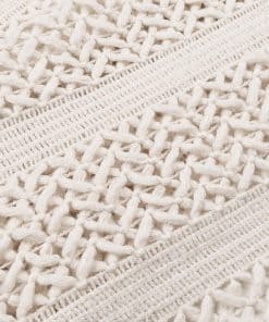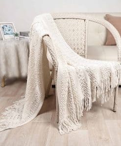 2. Estilo Elegante: Esta manta de punto para sofá muestra una exhibición impecable de arte a través de características de diseño elegantes. Las texturas en relieve proporcionan un ritmo visual. Las borlas encantadoras ofrecen un toque elegante para decorar un sofá.