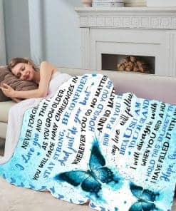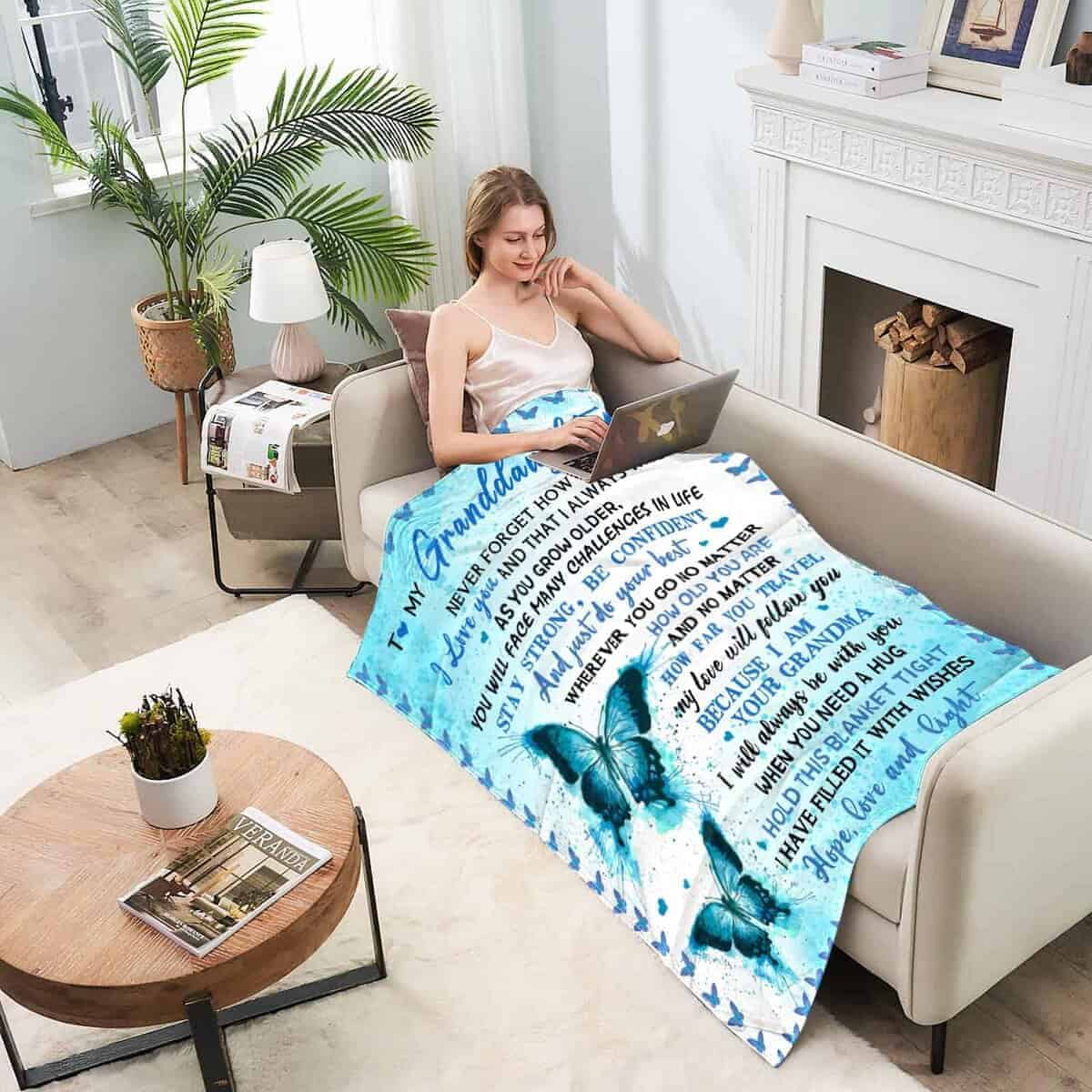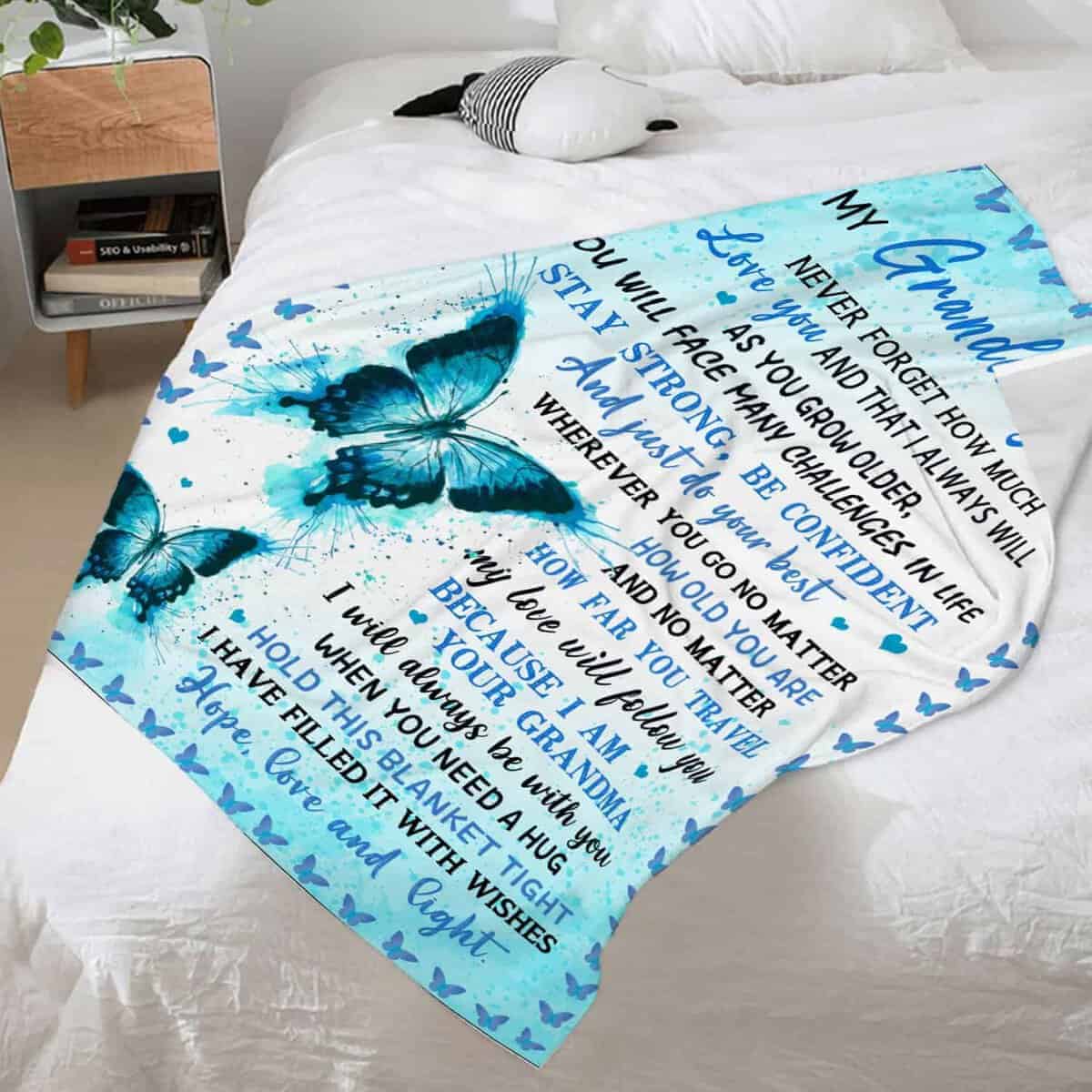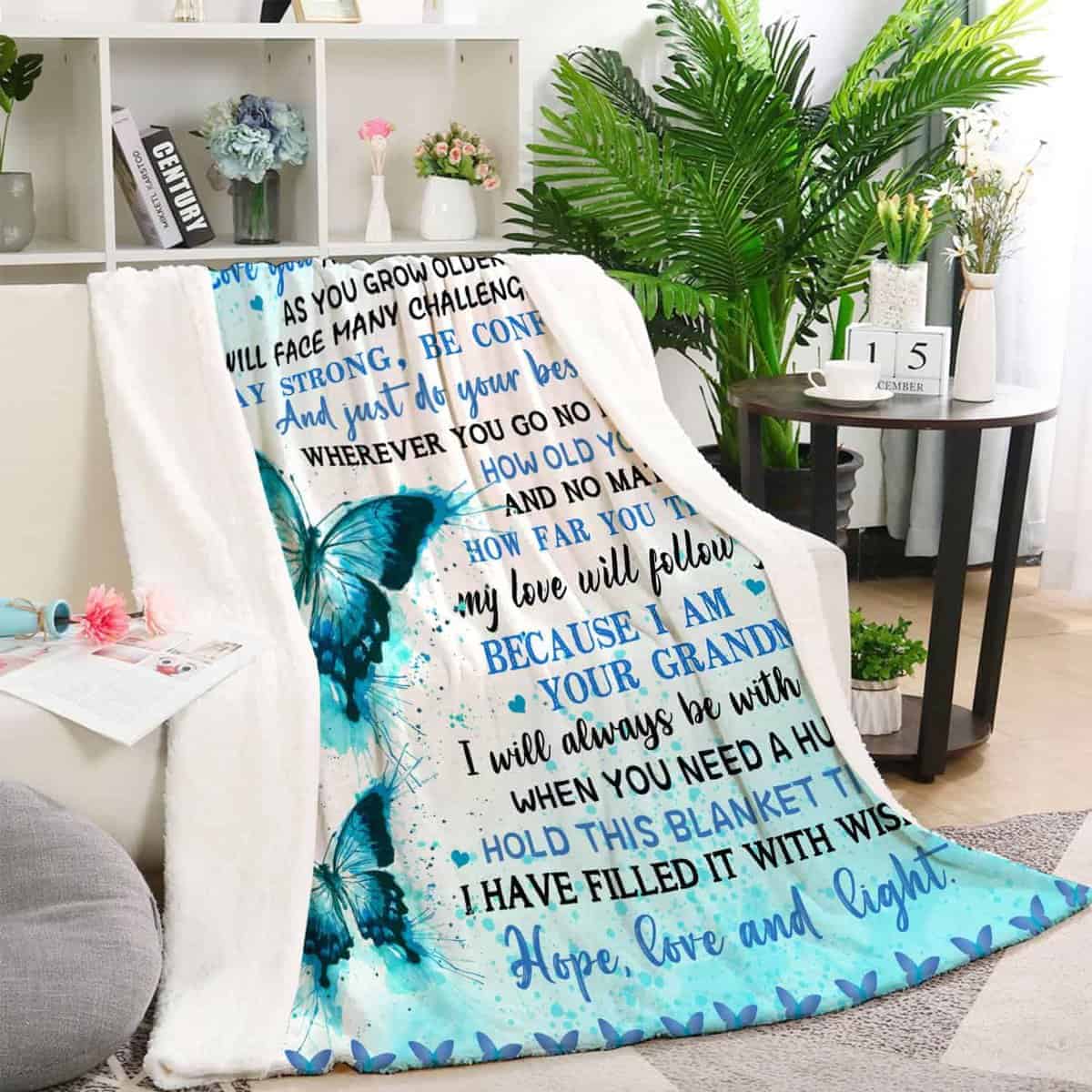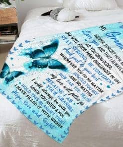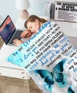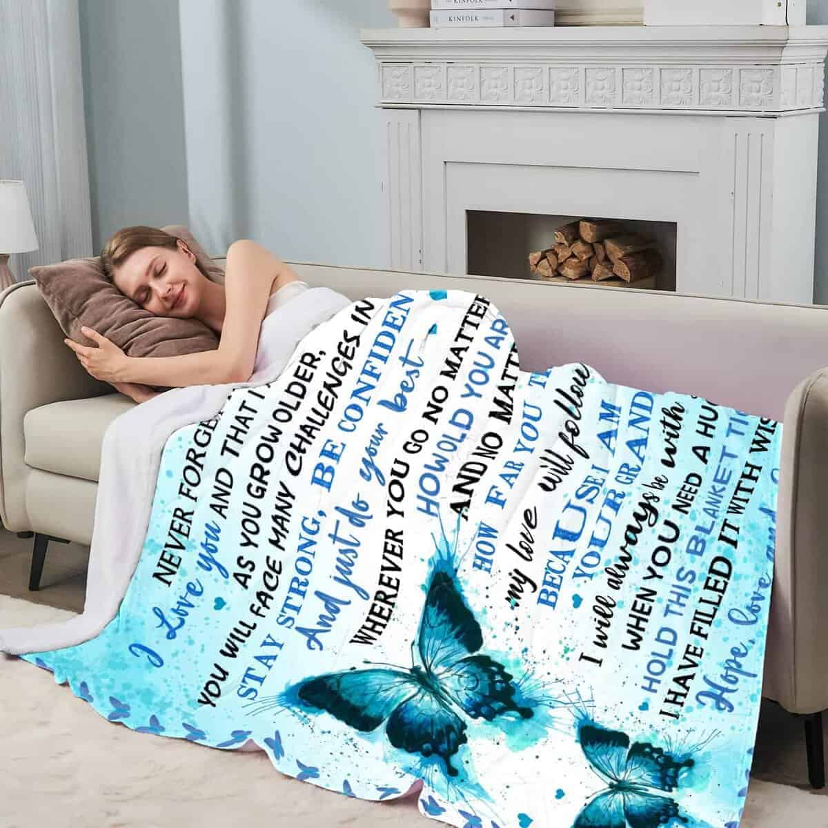 Perfecto regalo para nieta. Esta suave manta de franela está diseñada como un regalo personal y cariñoso para la nieta de parte de la abuela, haciéndola sentir cálida y amada. Es perfecta para cuando ve la televisión, lee un libro, en el sofá, en la cama, en noches frías, es el regalo de manta perfecto. Adecuado para todas las estaciones, uso interior y exterior. Ideal para aviones, campamentos, sofá, cama, exteriores y automóviles. Regala esta manta a tu nieta en Navidad, cumpleaños y otras festividades familiares, que es la mejor elección. Esta hermosa y elegante manta de mariposas azules está diseñada para brindar una sensación de lujo y elegancia, está hecha de franela de alta calidad, será un regalo esperado y atento para la nieta. Esta manta para nieta está diseñada para durabilidad y cuidado fácil con material de franela, garantiza suavidad duradera y viene en 60×80 pulgadas. También cuenta con mensajes para mostrar tu amor y expectativas para tu nieta. La manta para nieta es lavable a máquina en agua fría y se seca a baja temperatura, no se desvanece después de lavados repetidos, conserva sus colores vibrantes y está hecha para durar.