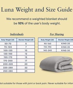 1. ¡Abraza el lujo y la comodidad con la manta ponderada de algodón Luna! Hecha de algodón suave certificado Oeko-Tex y rellena con cuentas de vidrio premium, disfruta de estimulación profunda por presión táctil para un efecto relajante y tranquilizador.