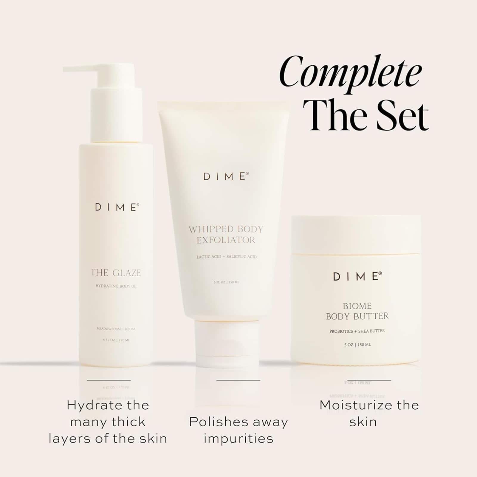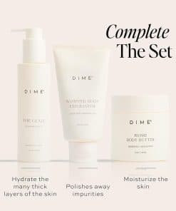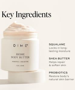 La crema corporal de Dime Beauty es rica en probióticos como el lactococcus ferment, ayudando a equilibrar la barrera cutánea natural del cuerpo, protegiendo contra factores estresantes externos y balanceando los niveles de pH de la piel. Los ingredientes limpios incluyen manteca de karité, vitaminas A y E para reducir la irritación, cera de semilla de girasol, manteca de mango, escualano, extracto de algas rojas, aceite de lavanda, aceite de menta, aceite de manzanilla y aloe. Aplica generosamente sobre la piel limpia y seca, masajeando hasta que se absorba completamente. Enfócate en áreas especialmente secas e irritadas como manos, pies y codos. Para obtener mejores resultados, utiliza diariamente. En Dime Beauty, la diferencia está en los detalles. Nos destacamos por nuestro packaging sostenible, ingredientes limpios, fórmulas veganas y libres de crueldad animal, y nuestro enfoque en tu bienestar. Cada ingrediente cuenta con una calificación segura del Environmental Working Group, para que puedas utilizar nuestros productos a diario con confianza.