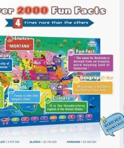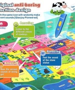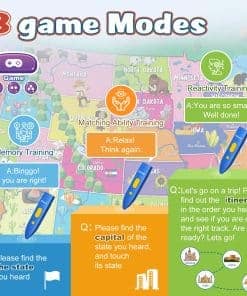 El Mapa de EE. UU. interactivo de Qiaojoy ha sido galardonado con varios premios, como el Sello de Aprobación del National Parenting Center 2021, Ganador del Premio Brain Child Tillywig 2022, Ganador del Premio NAPPA 2022 y Ganador del Premio de la Revista CREATIVE CHILD 2022. Es el mapa parlante electrónico favorito de los niños. ¡El regalo de Navidad y cumpleaños favorito de los niños! Este mapa educativo es ideal para niños que estudian en inglés y español. Viene con un bolígrafo aplicable en todos los productos de Qiaojoy; admite sonido de inicio personalizado y grabación. Los niños podrán explorar 10 funciones interactivas y 2000 datos divertidos sobre los Estados Unidos, incluyendo geografía, historia, cultura, política y más. Además de aprender los estados y capitales, los niños descubrirán celebridades, animales, hechos tradicionales divertidos de cada estado y mucho más. El diseño antirrozo del mapa permite que cada icono emita un sonido diferente al hacer clic en él, como el sonido de vacas, vaqueros, ballenas en el mar, barcos, etc. Esto crea una escena auditiva inmersiva inusual que hará que los niños se interesen más en el aprendizaje. El mapa incluye tres modos de juego desde fácil hasta difícil para ejercitar las habilidades de los niños y fortalecer su memoria. Desde el primer nivel de entrenamiento de memoria, el segundo nivel de entrenamiento de habilidad de emparejamiento, hasta el tercer nivel de entrenamiento de habilidad de reflexión, cada nivel es progresivo y desafiante, lo que ayuda a cultivar la sed de conocimiento de los niños.
