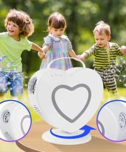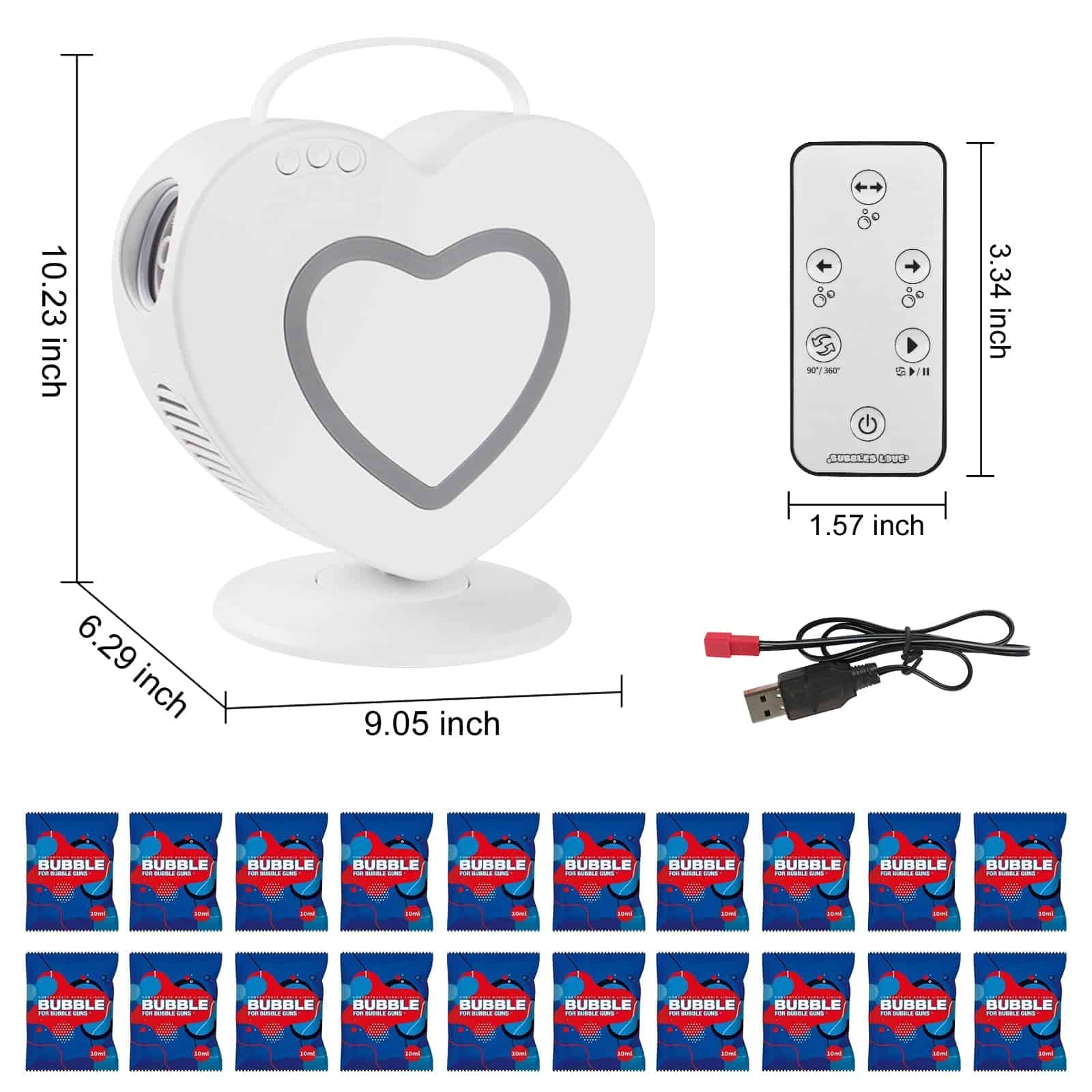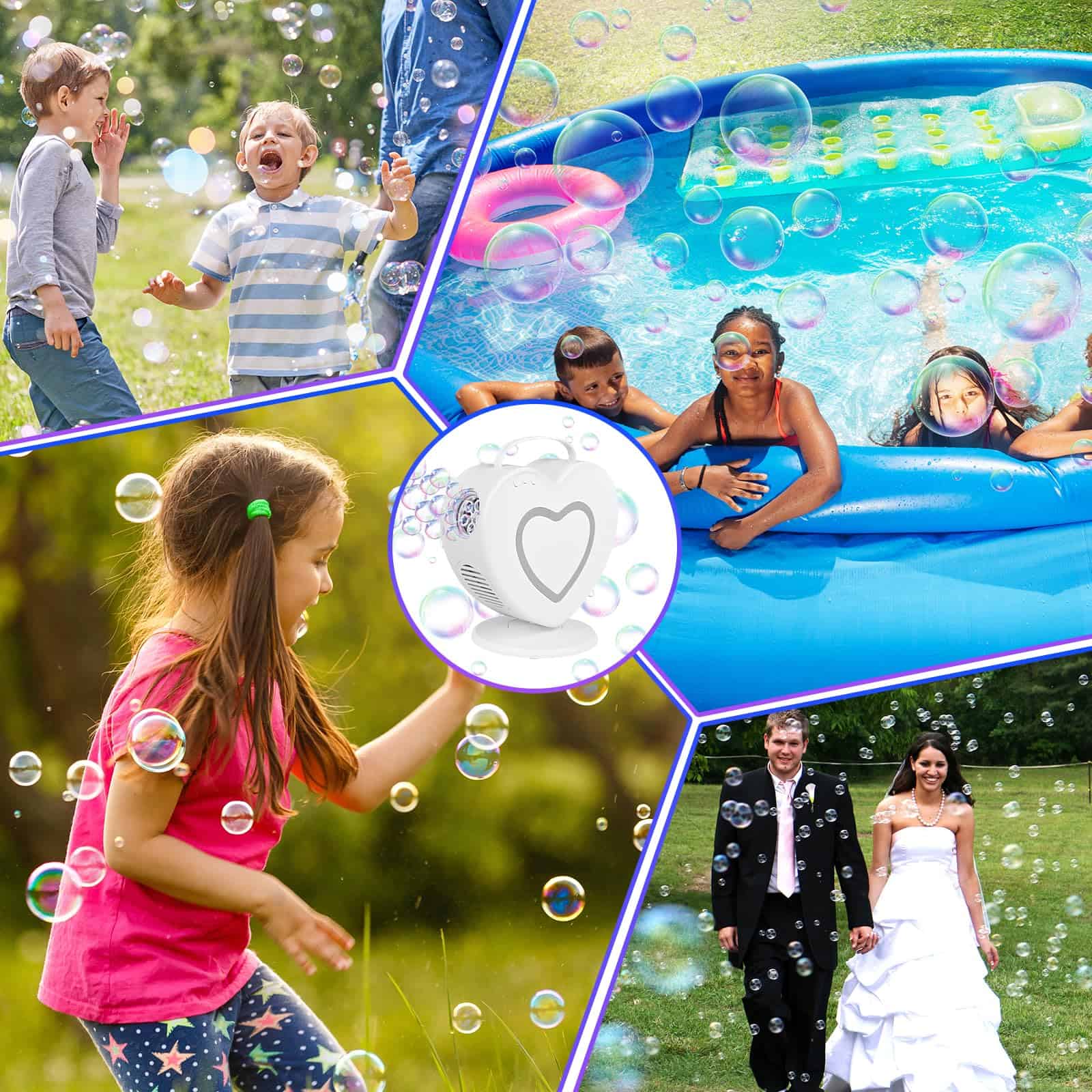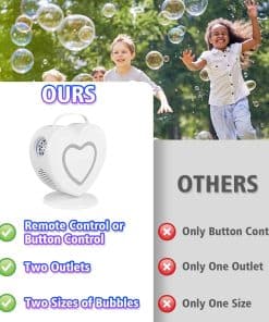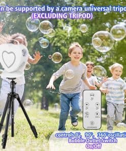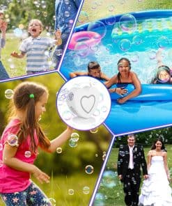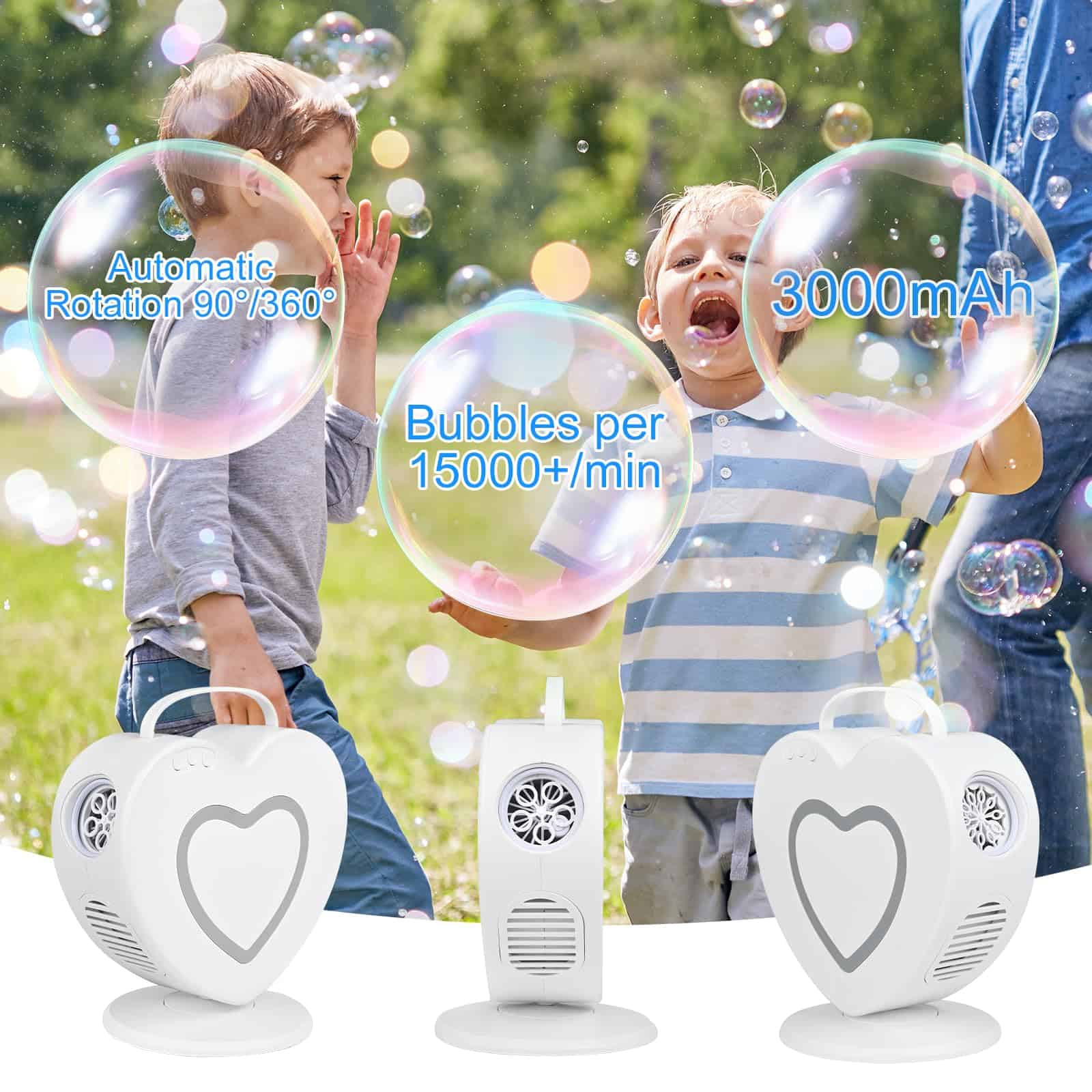 Esta Máquina de Burbujas para Niños y Adultos Puede Rotar Automáticamente 90 o 180 Grados. Sopla Automáticamente Más de 2,000 Burbujas por Minuto, y es Recargable para Juegos en Interiores o Exteriores, Fiestas, Cumpleaños, Bodas, y más.