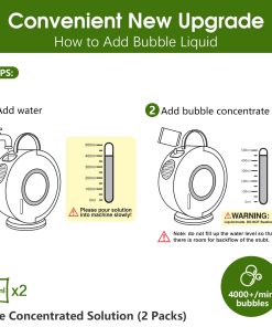 Máquina de Burbujas para Niños y Bebés, Soplador de Burbujas Automático Recargable, Burbujero Eléctrico Portátil con Rotación de 90° y 360° para Niños de 3 4 5 Años, Regalos para Bodas, Fiestas de Cumpleaños al Aire Libre. Máquina de Burbujas Rotatoria Automática: Con un ángulo de rotación de 90° / 360° y un gran alcance de 800 pies cuadrados, la máquina de burbujas envolvente de 360° crea un ambiente fantástico para todo tipo de fiestas, bodas, eventos al aire libre, cumpleaños y mucho más. Colóquela en el patio, en el parque o incluso en interiores para diversión festiva. Saluda a los niños y cachorros y haz que todos vuelvan a ser niños. 4000+ Salida de Burbujas y Larga Autonomía Extra: Almacenamiento de batería de gran capacidad con un puerto de carga tipo C conveniente que dura de 4.5 a 5 horas con una carga completa. No es necesario reemplazar las baterías. El gran tanque de agua y la varita giratoria eficiente crean más de 4000 burbujas por minuto para evitar interrupciones para rellenar y permitir más disfrute. Hace la mayor cantidad de líquido de burbujas mientras reduce el desperdicio. Fabricación Profesional de Burbujas Seguras: Mejor regalo de cumpleaños para niños de 3 4 5 años. La carcasa del soplador de burbujas de plástico ABS exterior es ligera pero duradera y no tóxica, es segura y resistente a tu alrededor o a los pequeños. Asa portátil, dos botones simples. Con línea de agua visible, puedes ver claramente cuánto líquido queda. La estructura interna de flujo de aire de la máquina de burbujas está expertamente diseñada para producir muchas burbujas mientras reduce el ruido. Ideal para uso en interiores y exteriores. Nuevo Puerto de Inyección de Agua y Burbuja Fluida Gratuita: Más fácil de operar, con el exclusivo llenador de agua en la superficie de la máquina de burbujas. Consejo: Es mejor agregar 50 ml de solución de burbujas concentrada y 450 ml de agua. La solución necesita ser agitada antes de su uso. Luego obtendrás muchas burbujas. Hay disponibles 2 paquetes de concentrados de burbujas de 50 ml. Mejor Regalo de Juguetes para Niños: Un excelente regalo que proporcionará horas de entretenimiento familiar y pondrá una sonrisa en la cara de cada niño, ¡las burbujas son la favorita de los niños! También perfecto para crear un ambiente romántico para reuniones como bodas, cumpleaños, fiestas, jardín al aire libre, playa, piscina, campamento, celebraciones, etc.