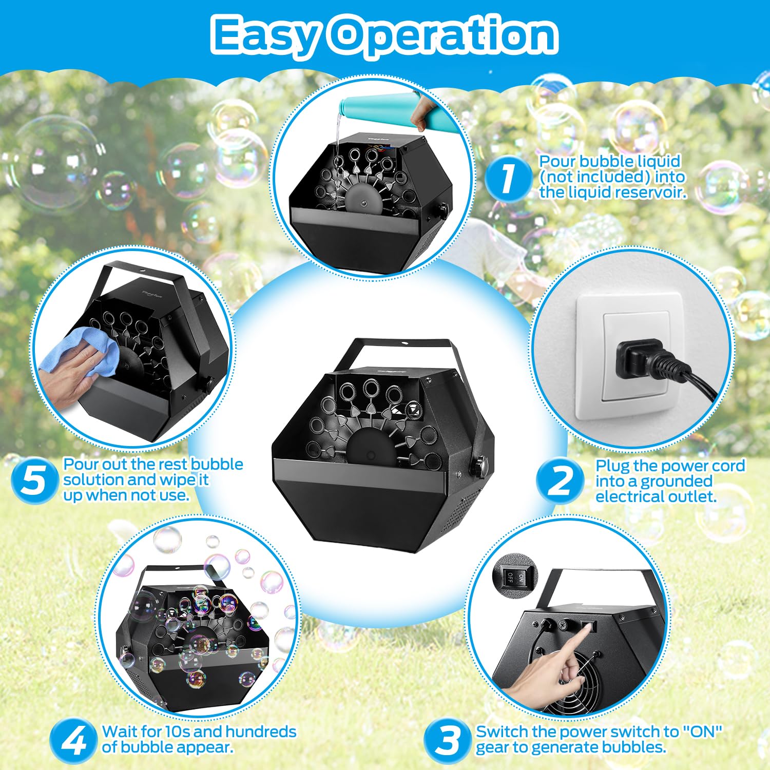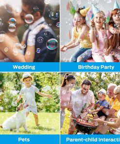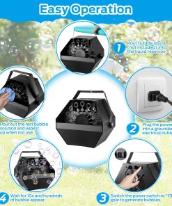 La Máquina de Burbujas Theefun produce una gran cantidad de burbujas mágicas en el aire, ideal para uso en interiores o exteriores, producciones escénicas o uso comercial. Produce burbujas sin parar y es perfecto para complementar fiestas de cumpleaños y festividades, picnics, parrilladas, bodas, aniversarios y muchos otros tipos de reuniones. Adecuado para uso en interiores o exteriores para crear una atmósfera soñadora para fiestas, escenarios, bodas, etc. La máquina de burbujas no debe usarse por más de 8 horas consecutivas y es mejor operarla a 40-90 grados. La realización de la máquina puede verse reducida en bajas temperaturas. Incluye una unidad de Máquina de Burbujas, un asa y un manual de usuario.