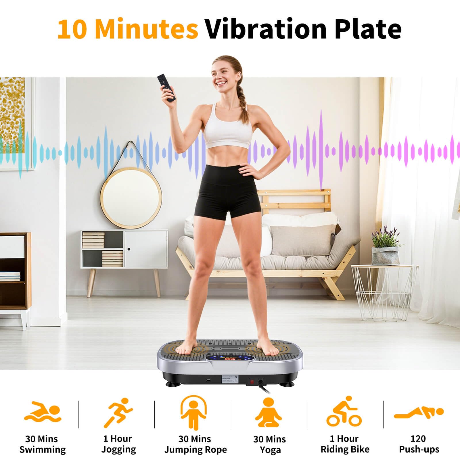 1. Control Preciso de la Vibración La placa de vibración cuenta con 5 programas automáticos y 120 velocidades manuales controladas con precisión por control remoto (necesita preparar dos baterías AAA), proporcionando quema de grasa personalizada, tonificación muscular y aumento de la circulación.