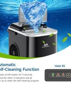 4. Función de Auto-Limpieza Esta pequeña máquina de hielo cuenta con una función de auto-limpieza, que puede reducir los depósitos de cal y asegurar que los cubos de hielo estén claros, limpios y sin olores. Después de encenderla, simplemente presione y mantenga presionado el botón de encendido durante 3 segundos para activar el modo de auto-limpieza.