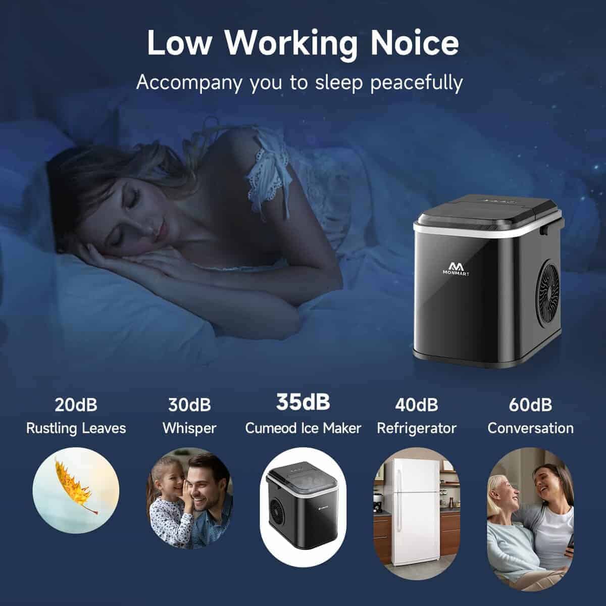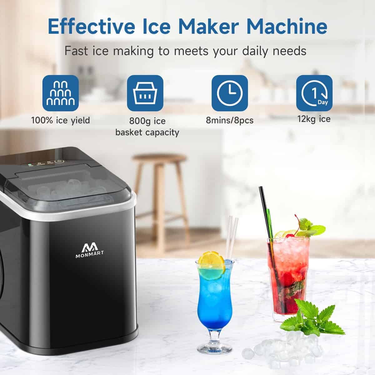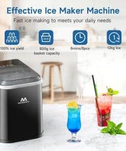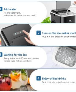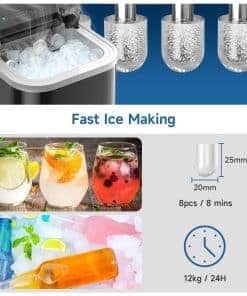1. Rápida Producción de Hielo en 6 Minutos 120W de alta potencia puede obtener 8 cubos de hielo en forma de bala en solo 6-10 minutos, hasta 26.5 libras de hielo en 24 horas, tasa de producción de hielo del 100%. Ya sea una fiesta, viaje de camping o uso diario, esta máquina de hacer hielo portátil puede proporcionarle suficientes cubos de hielo para ahorrarle tiempo y dinero.
