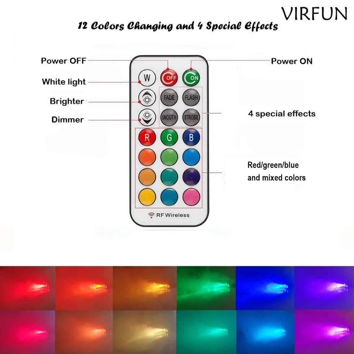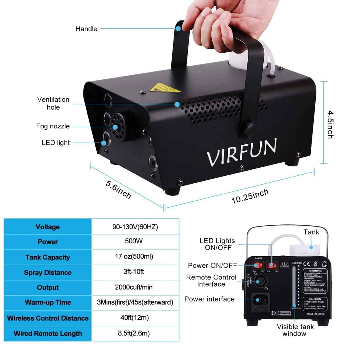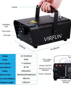 Instrucciones de uso: 1, Agrega líquido de humo profesional (no incluido) en el tanque. Asegúrate de que el líquido de humo se sumerja completamente en el tanque. De lo contrario, el dispositivo no funcionará correctamente. 2, Conecta la consola de control remoto con cable a la máquina. La consola de control remoto con cable debe estar conectada a la máquina de humo todo el tiempo que uses la máquina, ya que la consola de control con cable funciona como receptor de infrarrojos para el control remoto inalámbrico. 3. Enciende la energía y permite que la máquina se caliente durante aproximadamente 3 minutos (se reducirá a 45 segundos después de la primera vez), la luz roja se encenderá en el control remoto con cable cuando la máquina haya precalentado con éxito. Enciende las luces LED. 4, Puedes presionar y mantener presionado el botón en el control remoto con cable o presionar el botón DESBLOQUEO del control remoto inalámbrico según prefieras para emitir humo durante un máximo de 30 segundos por ciclo. Luego espera aproximadamente 1 minuto para el siguiente precalentamiento. 5, En cuanto al control remoto inalámbrico, una breve presión del botón DESBLOQUEO puede enviar una ráfaga de humo de hasta 30 segundos y una breve presión del botón BLOQUEO puede detener el rociado. 6, En cuanto al control remoto con cable, debes MANTENER PRESIONADO el botón rojo para producir humo. Si sueltas el botón, dejará de rociar inmediatamente. 7. Interruptor de encendido independiente de las luces LED (Cuando uses las luces, los dos interruptores deben estar encendidos al mismo tiempo). Presiona el control remoto blanco para controlar las luces (4 modelos, cambio de 12 colores). Puedes usar la función de la luz en lugar del humo o ambos. Especificaciones: – Potencia: 500W / Luz LED: 3W x6 – Voltaje: AC 110V / 60Hz – Capacidad del Tanque: 17 oz (500 ml) – Consumo de líquido: 7,5 ml / min – Tiempo de calentamiento: 3-4 minutos – Salida: 2000 cu.ft / min – Distancia de rociado: 3 m / 10 pies – Distancia RC: 14 m / 45 pies Longitud RC con cable: 2.5 m – Peso: 4.4 libras – Dimensiones: 26.5 x 14.2 x 11.5 cm Paquete: 1 x Máquina de Humo, 2 x RC Inalámbrico, 1 x RC con Cable, 1 x Asa, 2 x Tornillo, 1 x Manual del Usuario