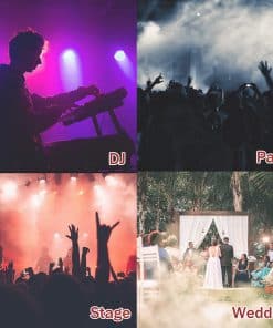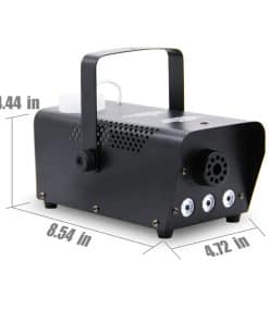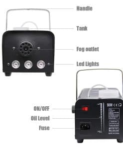 Especificaciones: Voltaje: CA 90-130 V 60 HZ, CA 220-240 V 50 Hz Potencia: 500 W Fuente de luz: LED 3 en 1 Capacidad del tanque: 350 ml Salida: 2000 cfm Consumo de fluido: 7.5 ml/min Tiempo de calentamiento: 3-5 min Distancia de salida: 2-3 m Controlador: Control remoto inalámbrico Longitud del control remoto: 5-8 m, hasta 12 m/40 pies Peso: 1.8 kgs Contenido del paquete: 1 x Máquina de Humo (el fluido de humo no está incluido) 1 x Control Remoto (BATERÍA de 23 A, 12 V, 50 mAH) 1 x Mango 2 x Tornillo 2 x Junta 1 x Manual de Usuario Notas: – El fluido de humo NO está incluido. – ¡Solo para uso en INTERIORES! No diseñado para uso en exteriores. – Utilice fluido de humo profesional. No agregue ningún líquido inflamable como aceite, gas natural, explosivos, perfume, etc. en su tanque. – No rocíe humo directamente sobre las personas y manténgalo alejado del fuego u otras fuentes de calor. – No es impermeable. Si hay gotas de agua o fluido de humo en su superficie, apague el dispositivo de inmediato y límpielo. – Verifique a menudo si hay suficiente fluido de humo en el tanque antes de usarlo para evitar daños.