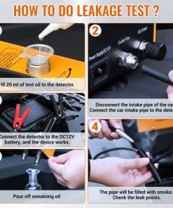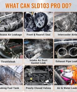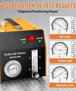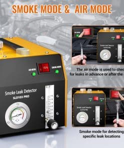Máquina de humo automotriz profesional con múltiples adaptadores de cono para vehículos y manguera de entrega de humo, ideal para comprobar sistemas de vacío, combustible, motor, admisión y más. Ligera y portátil, cuenta con una bomba de aire incorporada para trabajos sobre la marcha. Hecha de metal sólido y grueso, con protector inteligente que se apaga automáticamente si la temperatura excede el límite. Utiliza aceite para bebés para producir humo inofensivo. El medidor de flujo ajustable y el manómetro detectan incluso las fugas más pequeñas y soporta pruebas de decaimiento de presión. Incluye juego de 8 tapones de prueba de fuga de alta calidad y plástico para automóviles. Requiere un regulador adicional de baja presión para sistemas como EVAP.