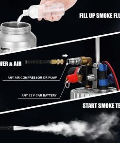 Máquina de humo automotriz de 12V DC con regulador incorporado, probador de fugas de humo que proporciona suficiente humo para sistemas sellados, colectores de admisión, detección de vacío en escapes, requiere suministro de aire externo. La herramienta perfecta para un diagnóstico DIY. Pagar a un taller por un diagnóstico de prueba de humo varía de $50 a $200. Nuestra máquina de humo muestra el mismo nivel de rendimiento que una máquina profesional, puede encontrar eficazmente la fuga de vacío y luego verificar que la fuga haya desaparecido y no haya otras presentes. Si le gusta trabajar en sus propios autos, esta será una gran herramienta. Viene con todo lo que necesita directamente de la caja. Ya sea que sea un mecánico de garaje o incluso un principiante, debería agregar esto a su colección de herramientas. Nota: use aceite mineral sin aroma, es más barato que el aceite de bebé y el aceite de bebé huele un poco. Al realizar pruebas de vacío usando un detector de fugas de humo, no toque directamente el tanque para evitar quemaduras.