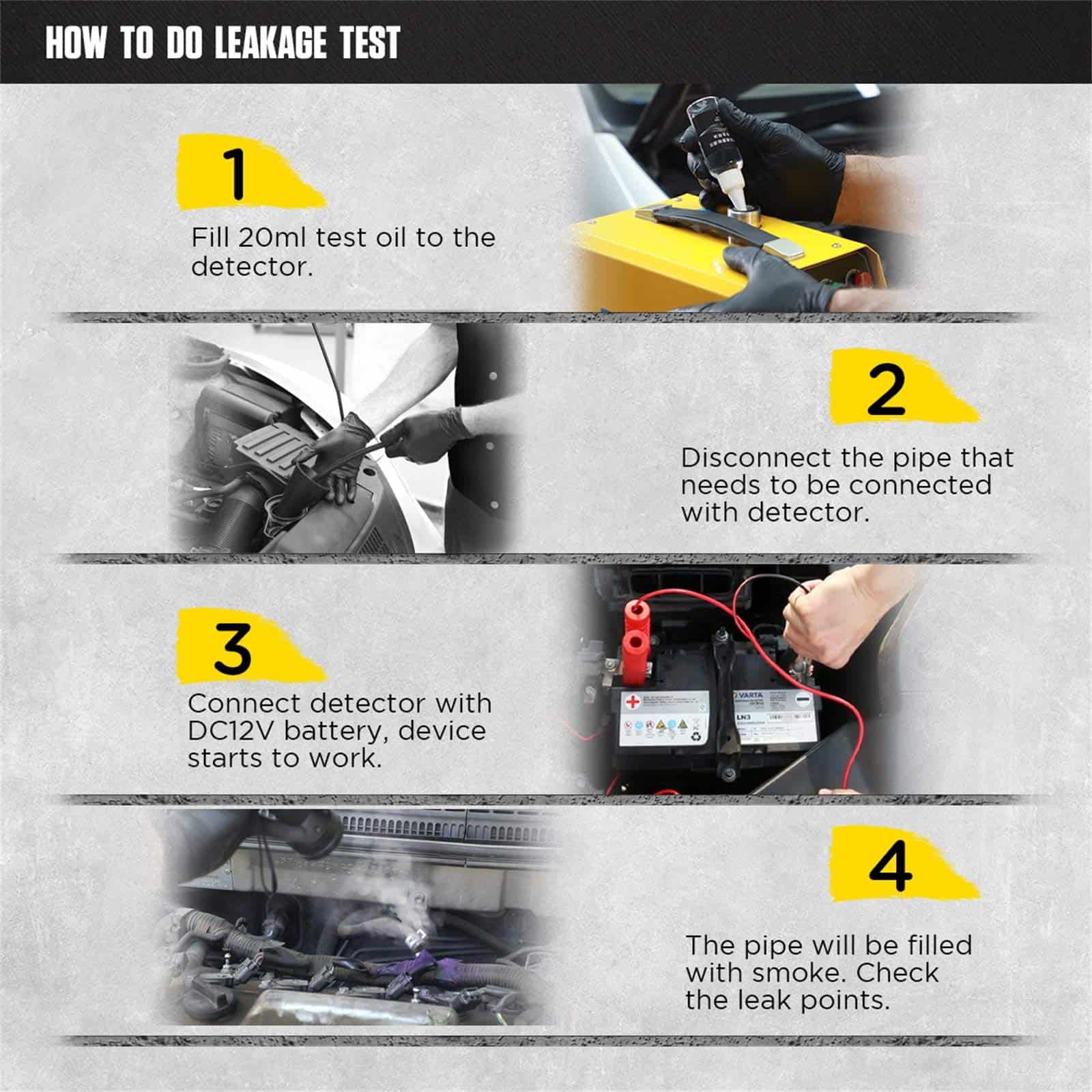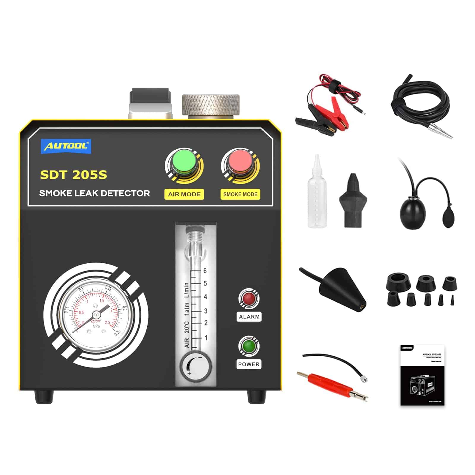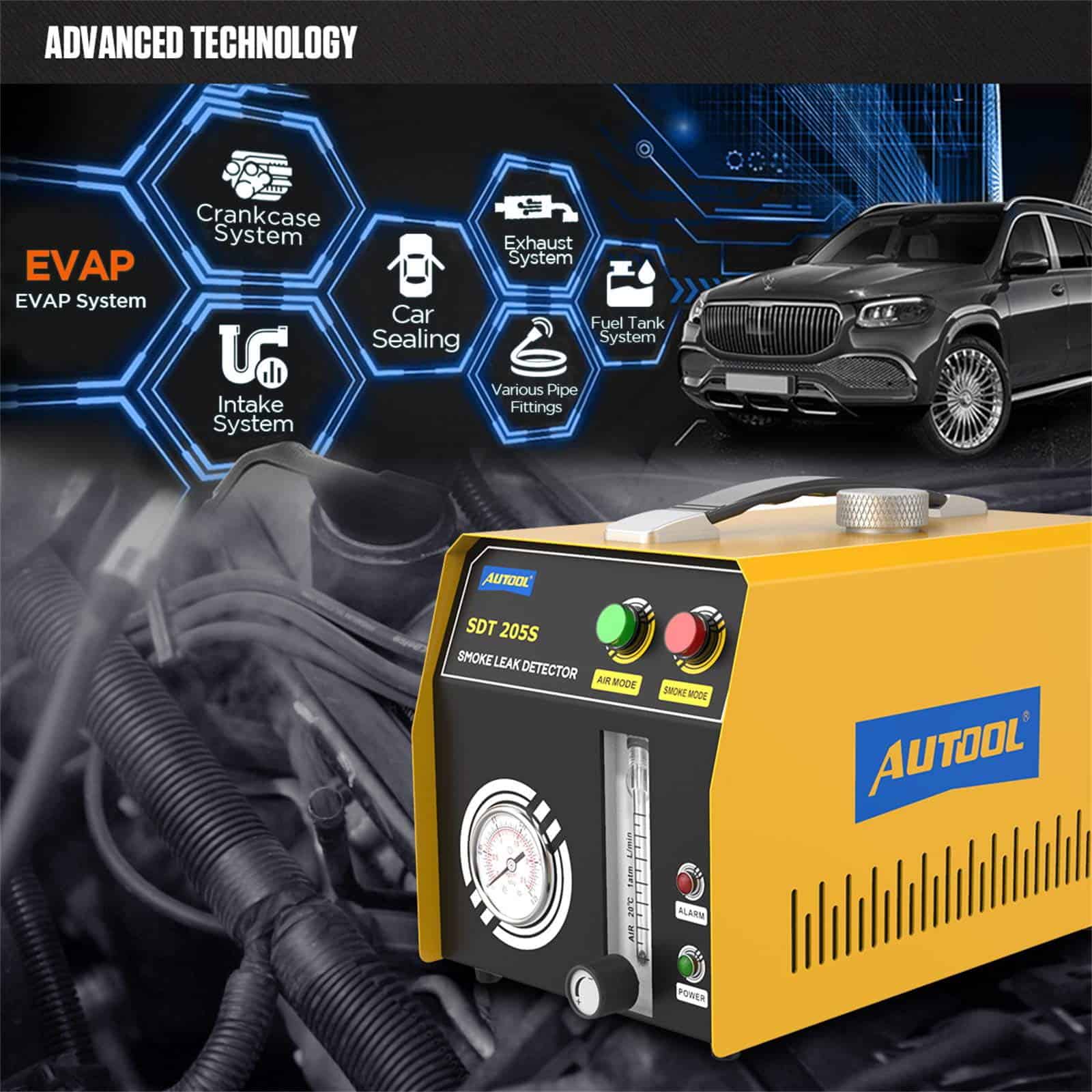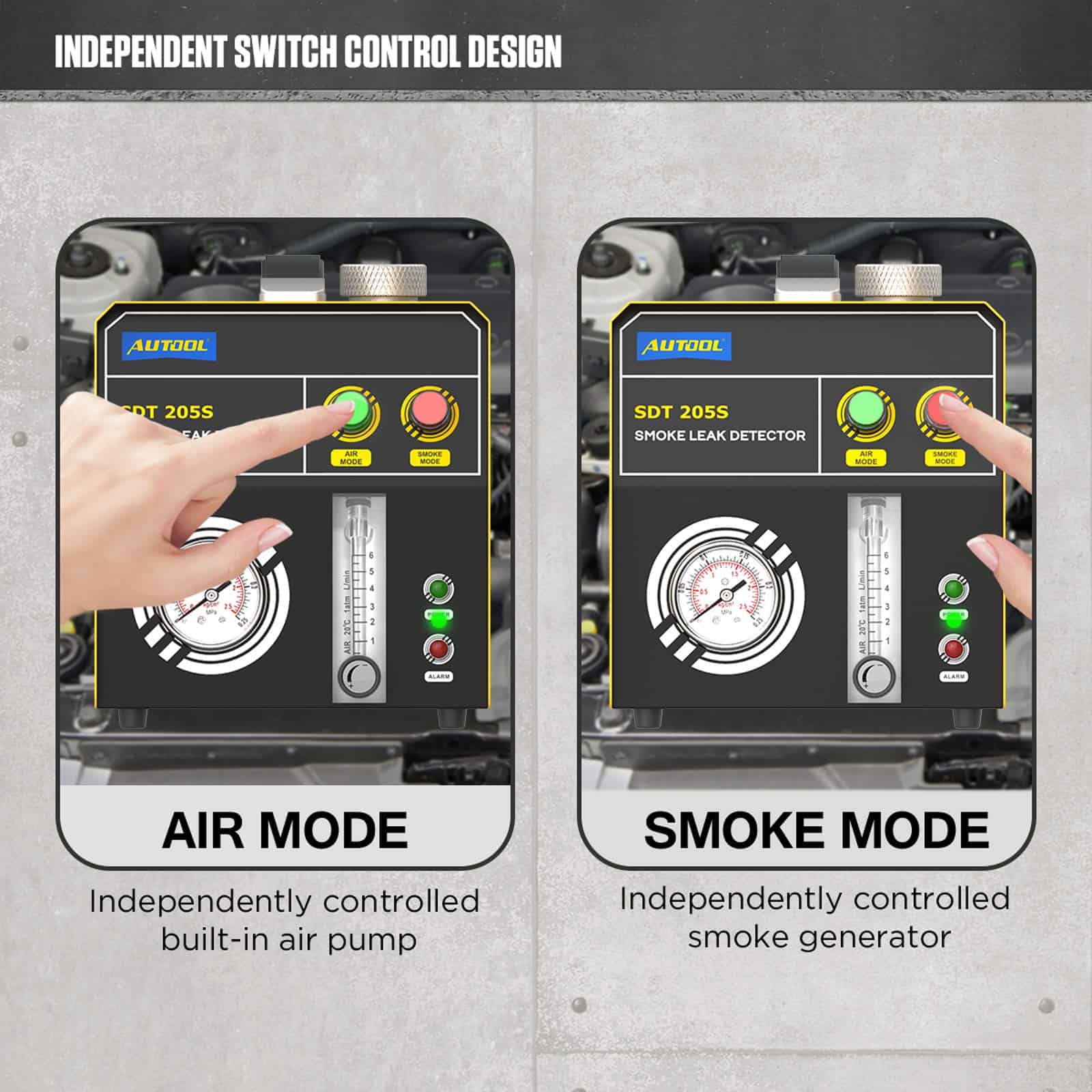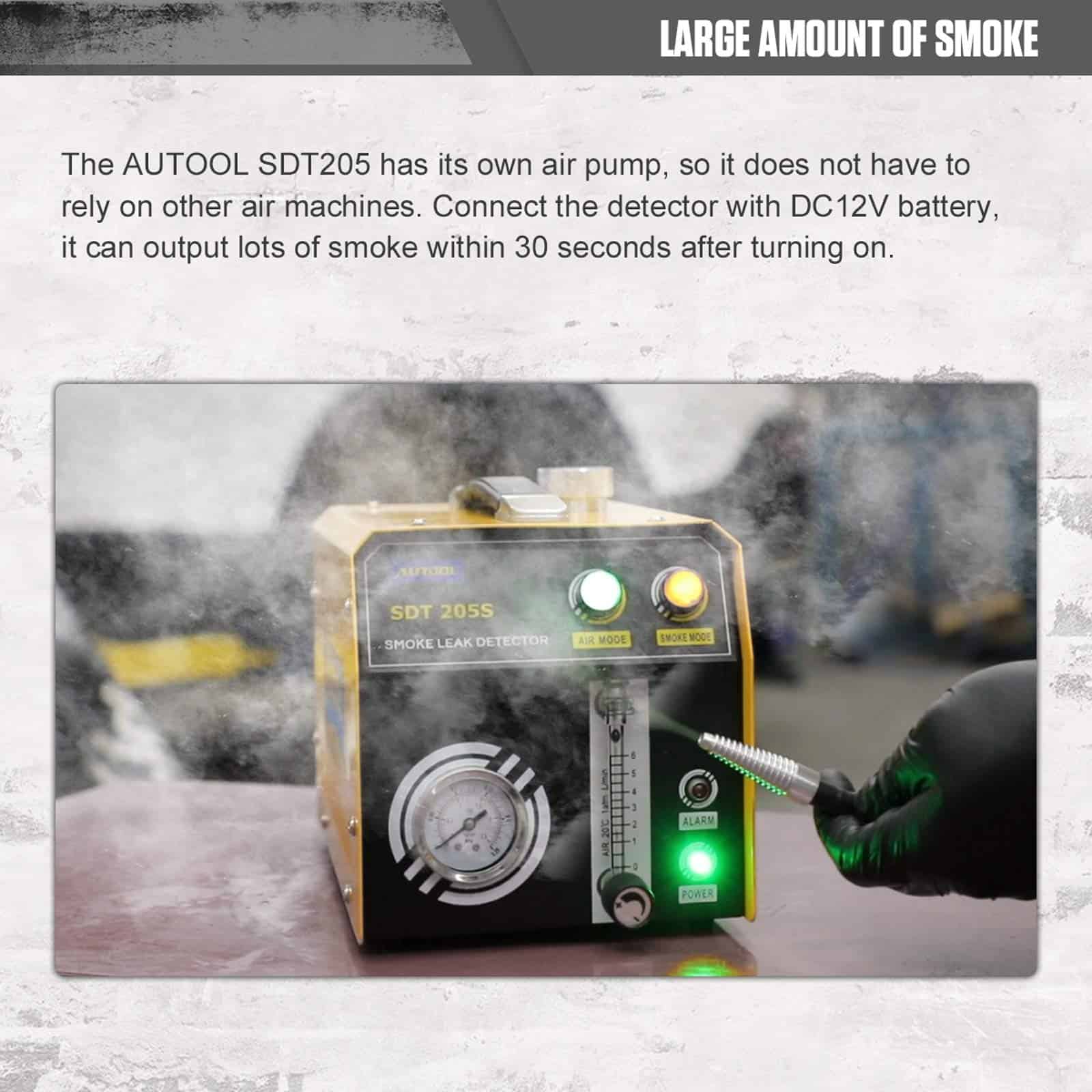 2. Modo de aire y modo de humo. ¡Con bomba de aire incorporada y generador de humo, por lo que no depende de una máquina adicional de aire, perfecto para Reparación Automotriz Móvil! El humo se puede producir en 10 segundos, reduciendo drásticamente el tiempo de diagnóstico. Valor de emisión de humo: 6L/min.