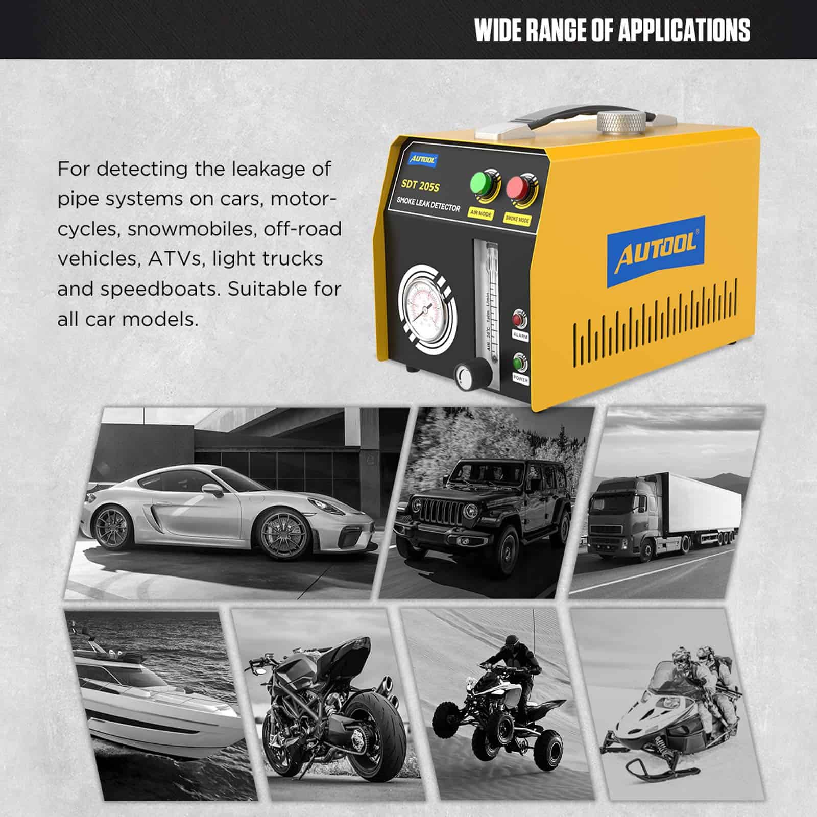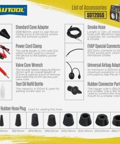 5. Medidor de flujo externo. Puede controlar fácilmente la presión de aire, ya que la presión de aire de cada tubería en el automóvil es diferente. Si la presión de aire es demasiado alta, la tubería se dañará, y si la presión de aire es demasiado baja, la fuga no será detectada. Por lo tanto, el medidor de flujo es muy importante para proteger su sistema de detección de manera más efectiva. Haga que las pruebas sean más seguras. 6. Garantía de tres años y mantenimiento de por vida. Por los daños causados por factores no humanos, AUTOOL promete reenviar las piezas de forma gratuita dentro de 3 años. Para cualquier demanda, le damos una calurosa bienvenida para contarnos, y le responderemos lo antes posible dentro de las 24 horas.