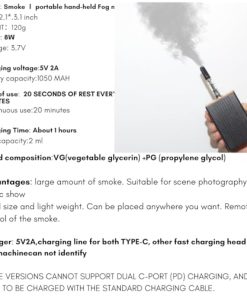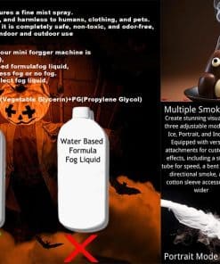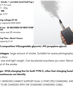 2. Fácil de usar: No se necesitan procedimientos complicados, es tan fácil como presionar un solo botón. Simplemente llene el fluido de humo en el tanque líquido, adjúntelo al cuerpo principal de la máquina de humo, y presione suavemente el botón A para encenderlo.