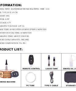 Instrucciones de uso de la máquina de humo portátil: Esta es una pequeña generadora de humo portátil diseñada para efectos especiales, cosplay, efectos especiales de humo, etc. Puede utilizarse para mejorar los efectos de producción y desempeño en películas a través del ambiente de producción. Lista de productos: Máquina de humo 1 Boquilla 1 Manguera 1 Cargador/cable de datos 1 Aceite atomizador 1 (hecho de propileno glicol: glicerol/1:1).